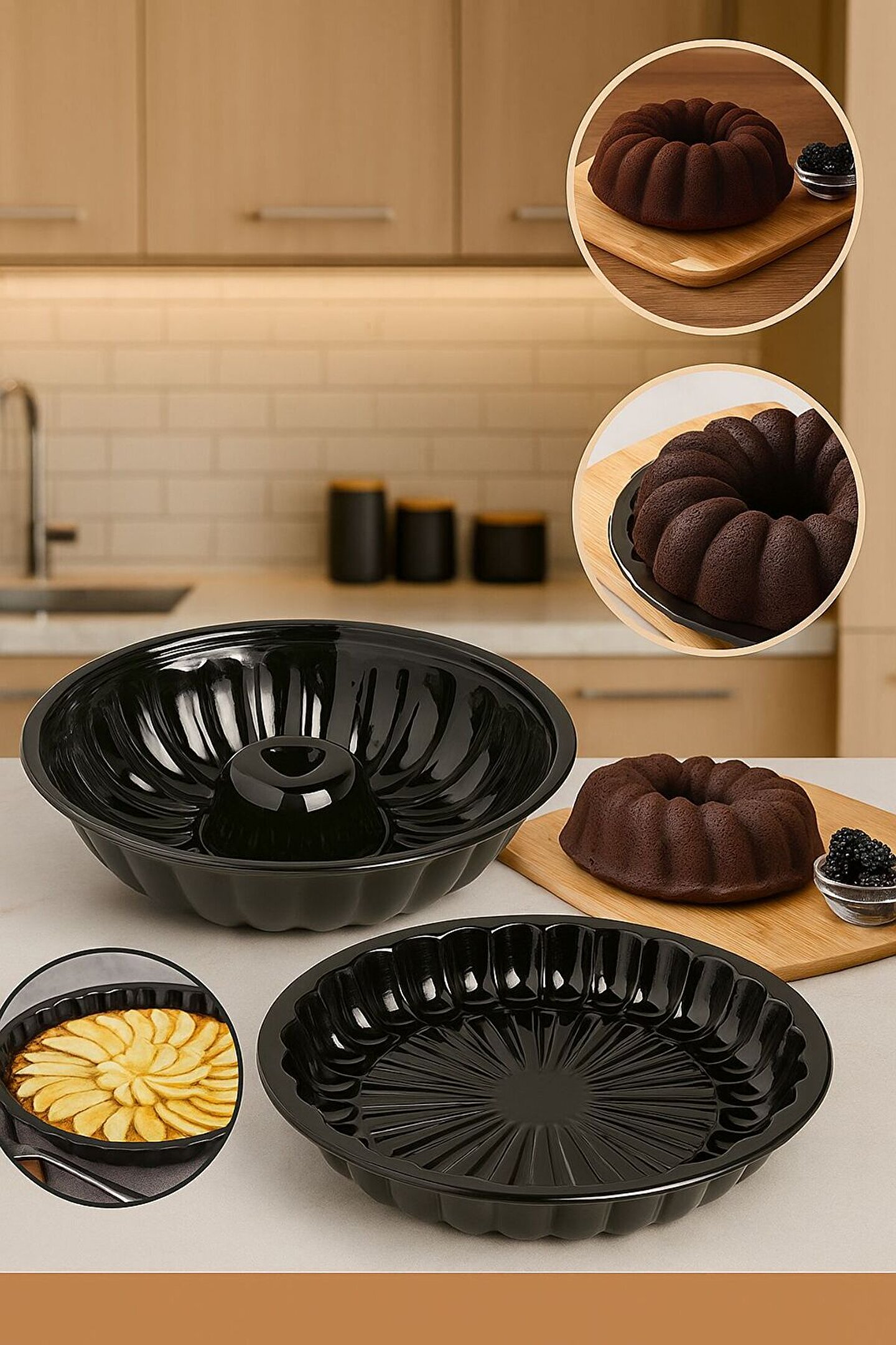 2’li Siyah Desenli Kek ve Tart Kalıbı Seti – Isıya Dayanıklı ; Ürün Açıklaması: Mutfakta şıklığı ve işlevselliği bir araya getiren bu 2’li siyah kalıp setiyle kek ve tartlarınız artık hem göz alıcı hem de kusursuz pişiyor! kek kalıbı ve güneş desenli tart kalıbıyla her tarifinizi estetik sunumlarla taçlandırabilirsiniz.; Isıya dayanıklı plastikten üretilmiş olan bu kalıplar, kolay temizlenebilir yüzeyi sayesinde pratiklik sunar.; Tatlı ve tuzlu tariflerinizde gönül rahatlığıyla kullanabilirsiniz.; Ürün Özellikleri: •Paket İçeriği: 1 adet kek kalıbı + 1 adet tart kalıbı •Renk: Parlak siyah •Malzeme: Isıya dayanıklı metal •Kalıp Tipi: kek kalıbı & desenli tart kalıbı •Kullanım Alanı: Kek, tart, pasta, kiş vb.; hamur işleri •Kolay temizlenebilir yapı •Fırın kullanımına uygundur •Şık sunumlar için ideal
