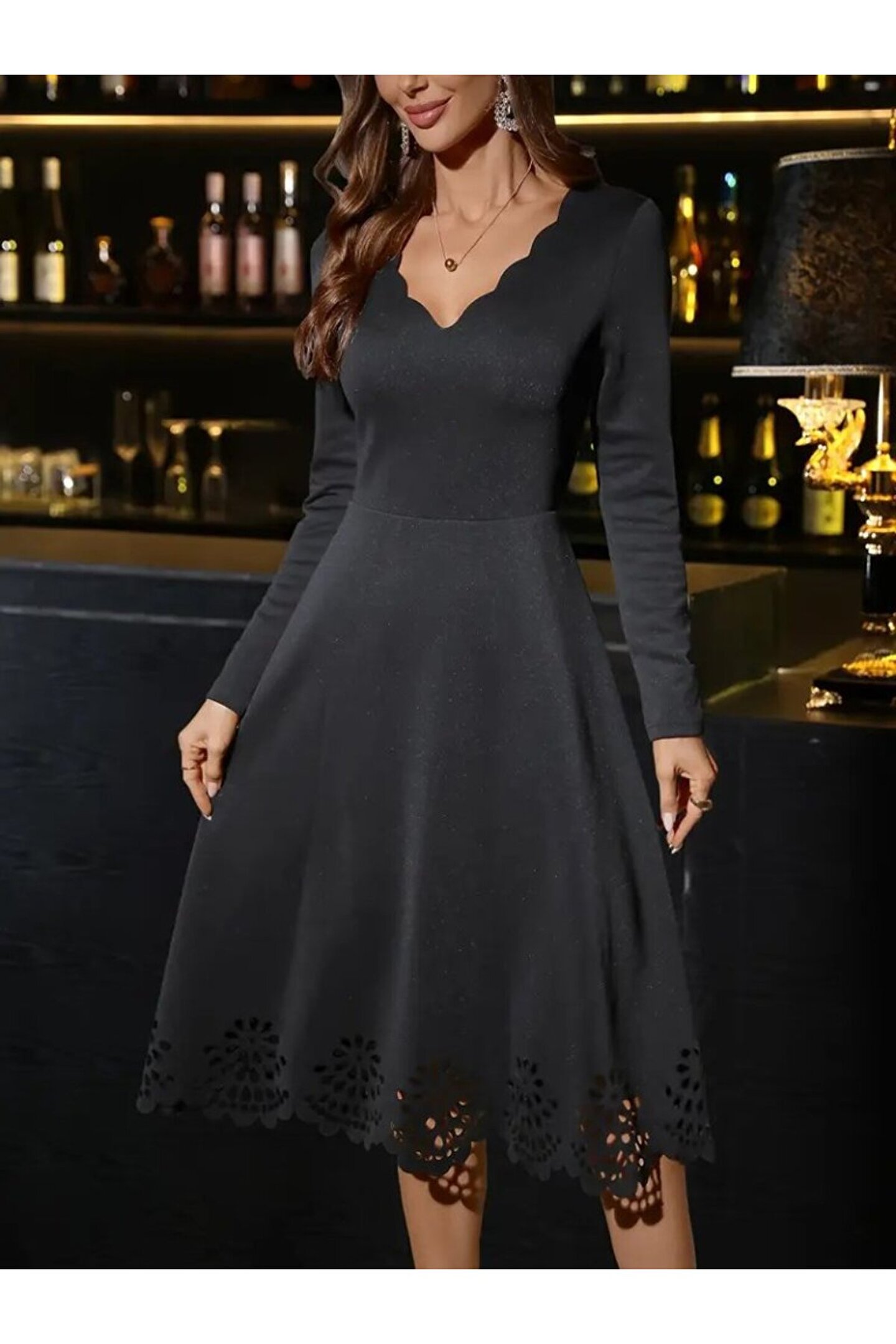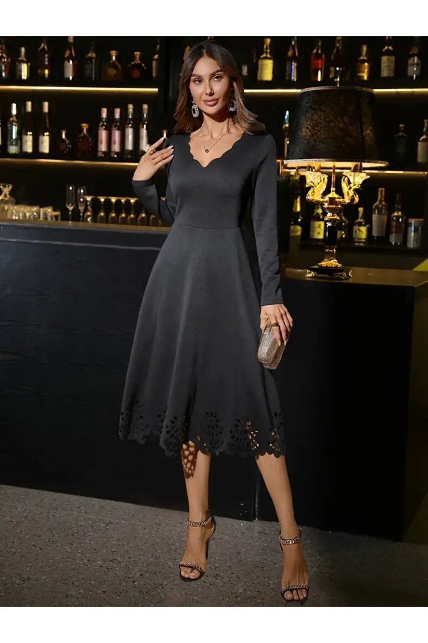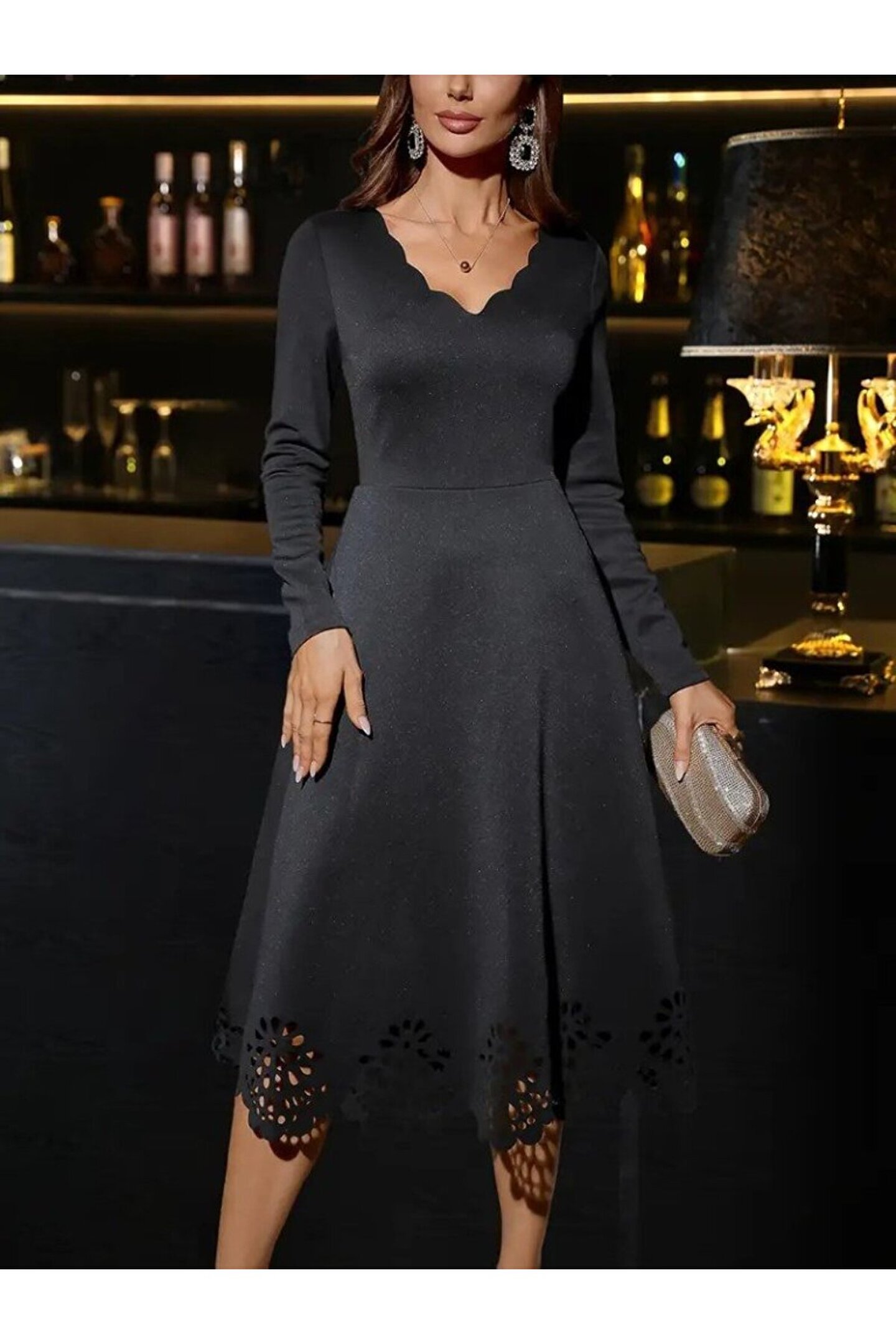 Kadın Uzun Kollu V Yakalı Lazer Kesim Detaylı Midi Ithal Krep Elbise