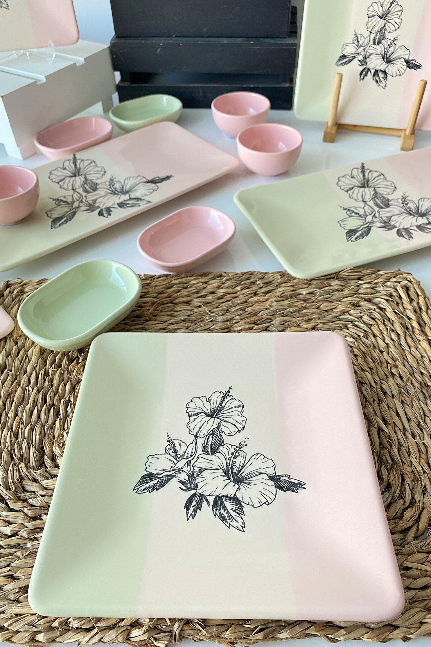 6 adet 20cm desenli kare pasta tabağı; 2 adet 31*21cm desenli dikdörtgen kayık ; 3 adet 8cm açık pembe kahvaltılık kase ; 2 adet 11cm açık yeşil kahvaltılık ; 2 adet 11cm açık pembe kahvaltılık; Ürün kullanımı: Renkleri ve baskısı solmaz. Kolay temizlenir, mikrop barındırmaz. ; Bulaşık makinesi normal ayarında yıkanabilir. ; Tamamen sağlıklı ve ekolojik malzeme yapısına sahiptir. ; Türkiye’de üretilmiştir. ; Almış olduğunuz bu üründe kırık ürün değişim garantisi bulunmaktadır. Koli içerisinde bilgilendirme broşürü yer almaktadır. ; Taşıma esnasında kırılma riskine karşı güvenli paketleme yapılarak gönderimi sağlanmaktadır. ;