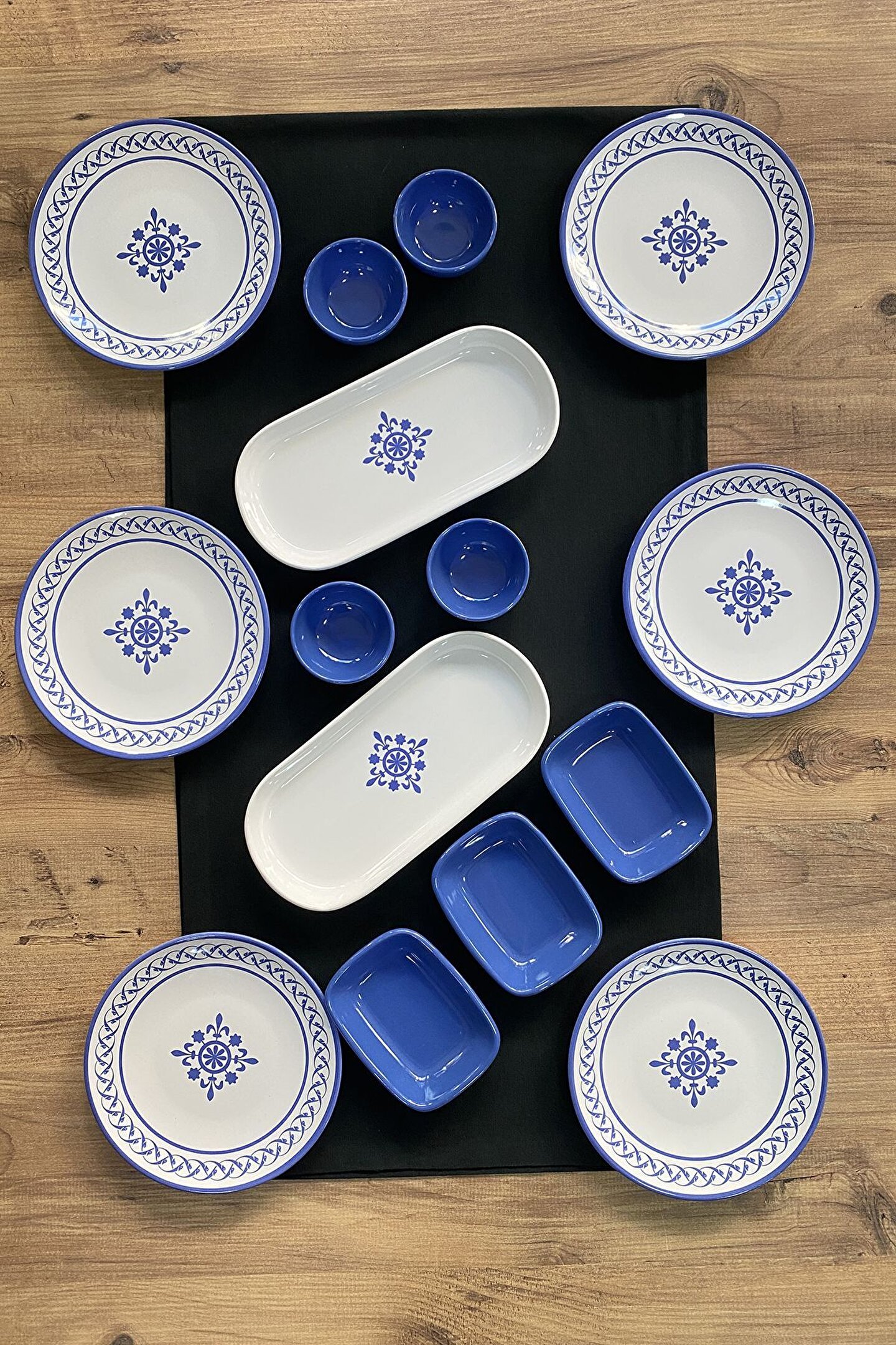 6 adet 20cm desenli kahvaltı tabağı ; 4 adet 8cm mavi yuvarlak kahvaltılık ; 3 adet 13cm mavi dikdörtgen kahvaltılık; 2 adet 26cm desenli kayık tabak ; Ürün kullanımı: Renkleri ve baskısı solmaz. Kolay temizlenir, mikrop barındırmaz. ; Bulaşık makinesi normal ayarında yıkanabilir. ; Tamamen sağlıklı ve ekolojik malzeme yapısına sahiptir. ; Türkiye’de üretilmiştir. ; Almış olduğunuz bu üründe kırık ürün değişim garantisi bulunmaktadır. Koli içerisinde bilgilendirme broşürü yer almaktadır. ; Taşıma esnasında kırılma riskine karşı güvenli paketleme yapılarak gönderimi sağlanmaktadır. ; Koli Ölçüleri : 36x36x22 CM ; Koli Ağırlığı : 5 KG ;