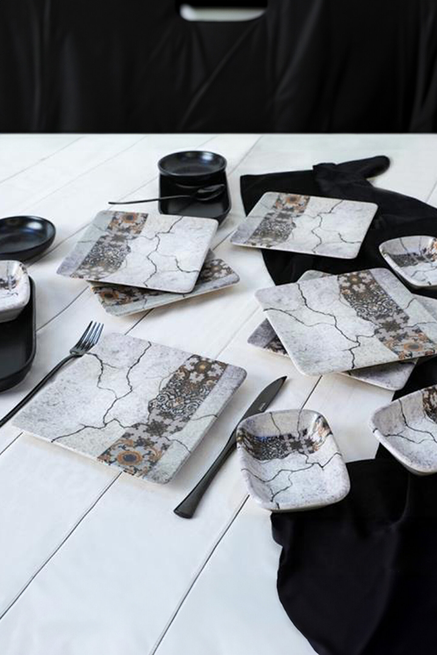 6 adet 20cm desenli kare tabak ; 4 adet 13cm desenli dikdörtgen ; 2 adet 13cm siyah kase ; 2 adet 26cm siyah kayık ; Ürün kullanımı: Renkleri ve baskısı solmaz. ; Kolay temizlenir, mikrop barındırmaz. ; Bulaşık makinesi normal ayarında yıkanabilir. ; Tamamen sağlıklı ve ekolojik malzeme yapısına sahiptir. ; Türkiye’de üretilmiştir. ; Almış olduğunuz bu üründe kırık ürün değişim garantisi bulunmaktadır. Koli içerisinde bilgilendirme broşürü yer almaktadır. ; Taşıma esnasında kırılma riskine karşı güvenli paketleme yapılarak gönderimi sağlanmaktadır. ;