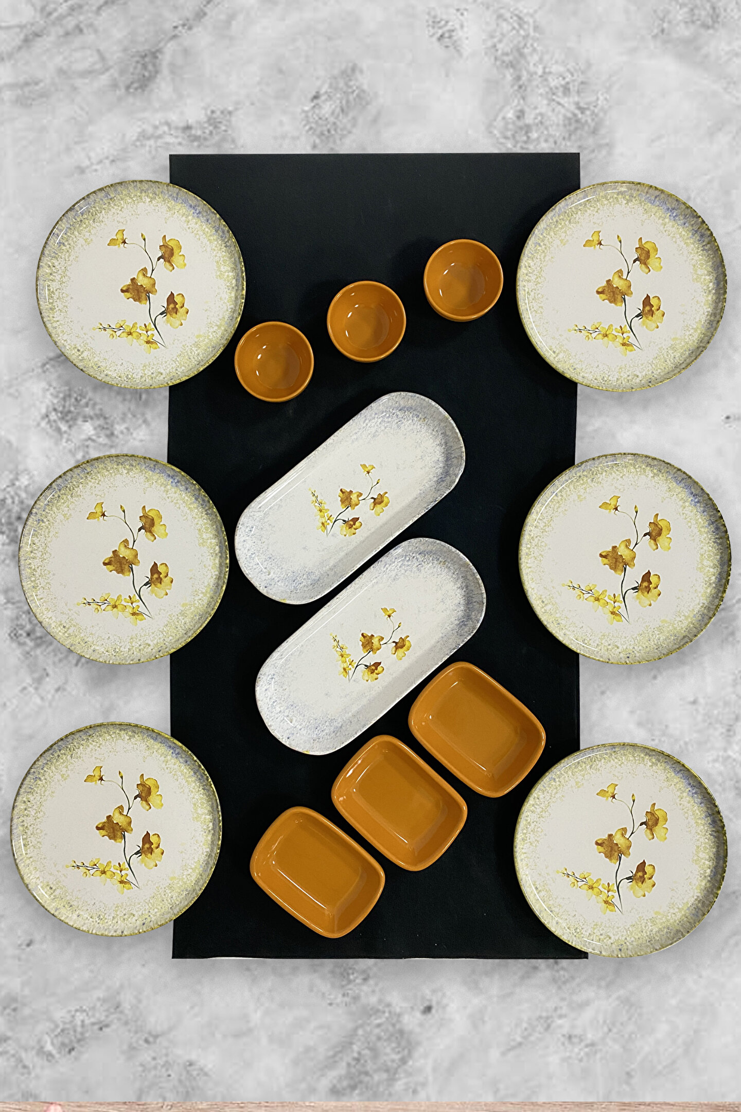 - 6 kişilik geniş kapasiteye sahip, herkesin keyifle kullanabileceği Hercai kahvaltı takımı.; - Mikrodalgada güvenle kullanılabilen dayanıklı stoneware malzeme ile uzun ömürlü kullanım sunar.; - Şık ve modern bir görünüm kazandıran çiçek desenleriyle sofralarınıza estetik bir dokunuş ekler.; - Canlı sarı rengiyle dikkat çeken bu takım, mutfak dekorasyonunuza renk katmak için idealdir.; - Toplamda 14 parça