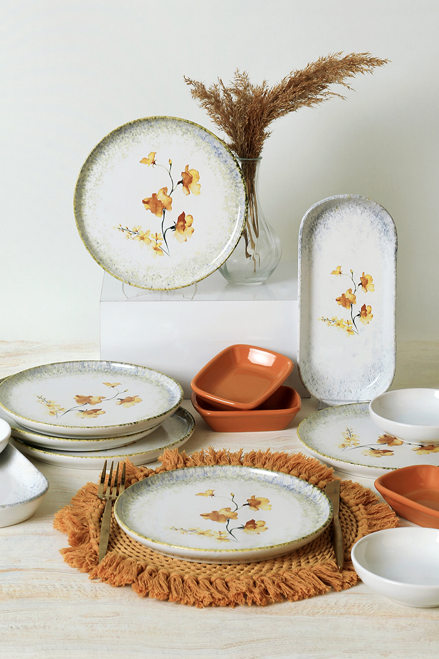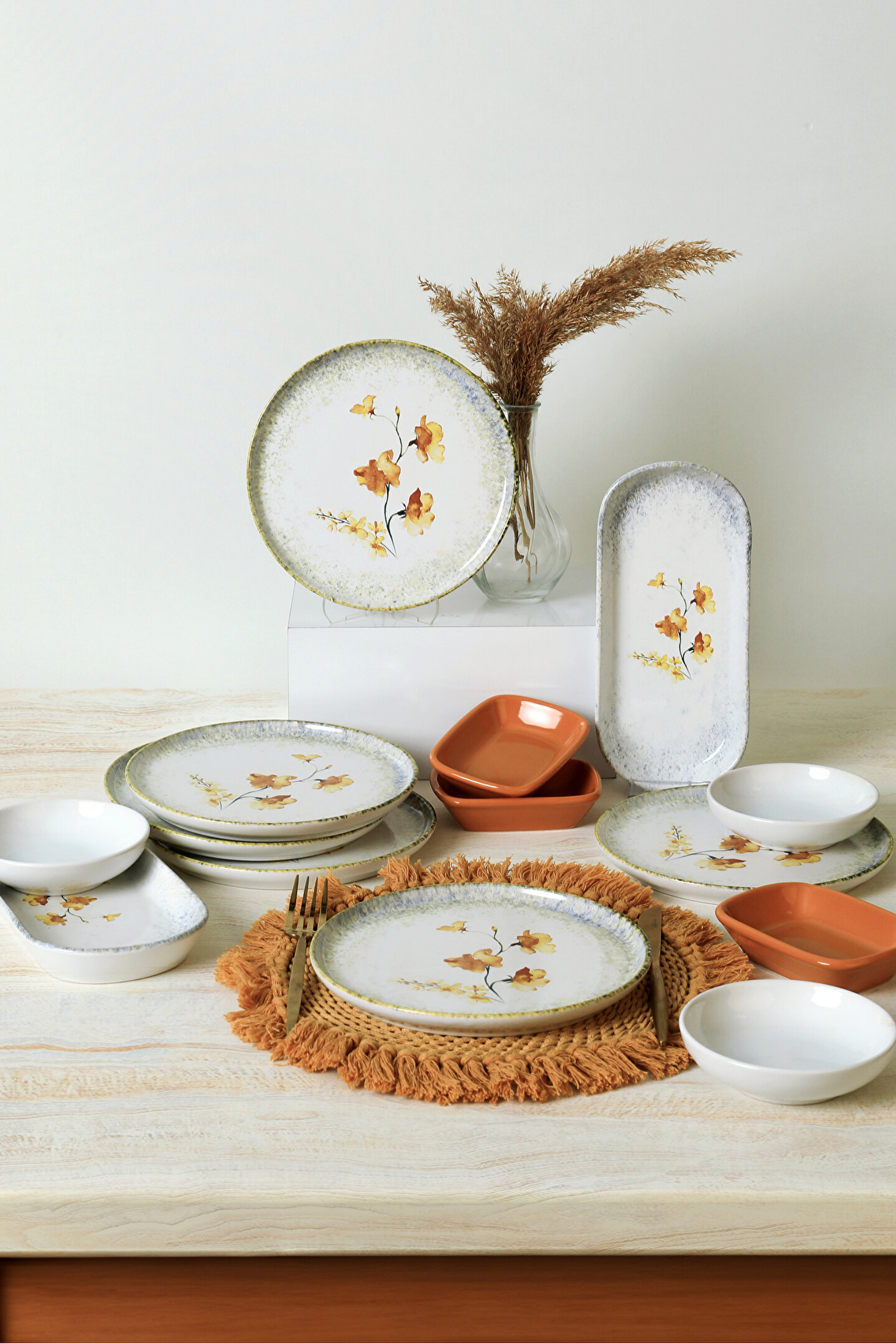 6 adet 22cm desenli tabak ; 3 adet 13cm beyaz kase ; 3 adet 13cm sarı dikdörtgen ; 2 adet 26cm kayık ; Ürün kullanımı: Renkleri ve baskısı solmaz. ; Kolay temizlenir, mikrop barındırmaz. ; Bulaşık makinesi normal ayarında yıkanabilir. ; Tamamen sağlıklı ve ekolojik malzeme yapısına sahiptir. ; Türkiye’de üretilmiştir. ; Almış olduğunuz bu üründe kırık ürün değişim garantisi bulunmaktadır. Koli içerisinde bilgilendirme broşürü yer almaktadır. ; Taşıma esnasında kırılma riskine karşı güvenli paketleme yapılarak gönderimi sağlanmaktadır. ; Koli Ölçüleri : 36x36x22 CM ; Koli Ağırlığı : 6 KG ;