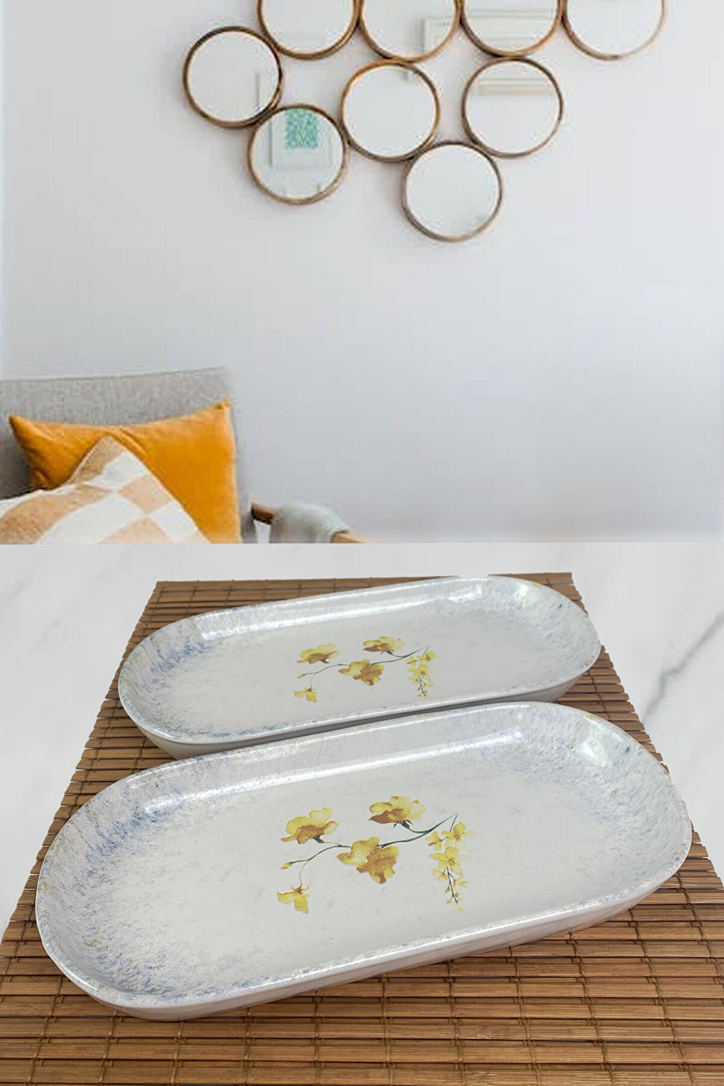 Mikrodalgada güvenle kullanılabilen yapısı sayesinde, sıcak yemeklerinizi pratik bir şekilde ısıtabilirsiniz; Dikdörtgen tasarımı ile modern ve şık bir görünüm sunar, sofralarınıza estetik bir dokunuş katar; Çiçekli deseniyle göz alıcı bir stil sergileyen bu tabaklar, sofralarınıza baharın tazeliğini getirir; Stoneware materyali sayesinde dayanıklılık ve uzun ömürlü kullanım vaat eder; Kayık tabak formu ile hem göze hitap eder hem de servis sırasında kolaylık sağlar;