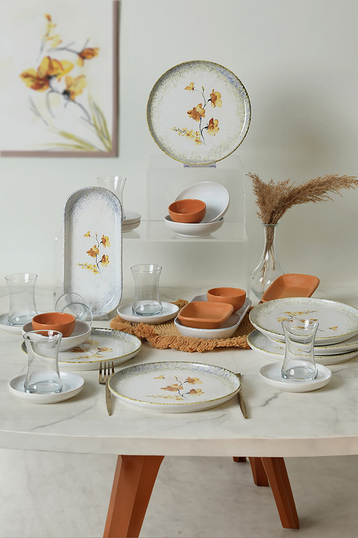 6 adet 22cm desenli tabak ; 6 adet cam çay bardağı ; 6 adet beyaz çay tabağı ; 3 adet 13cm beyaz kase ; 3 adet 8cm sarı kase ; 3 adet 13cm sarı dikdörtgen ; 2 adet 26cm kayık ; Ürün kullanımı: Renkleri ve baskısı solmaz. ; Kolay temizlenir, mikrop barındırmaz. ; Bulaşık makinesi normal ayarında yıkanabilir. ; Tamamen sağlıklı ve ekolojik malzeme yapısına sahiptir. ; Türkiye’de üretilmiştir. ; Almış olduğunuz bu üründe kırık ürün değişim garantisi bulunmaktadır. Koli içerisinde bilgilendirme broşürü yer almaktadır. ; Taşıma esnasında kırılma riskine karşı güvenli paketleme yapılarak gönderimi sağlanmaktadır. ;