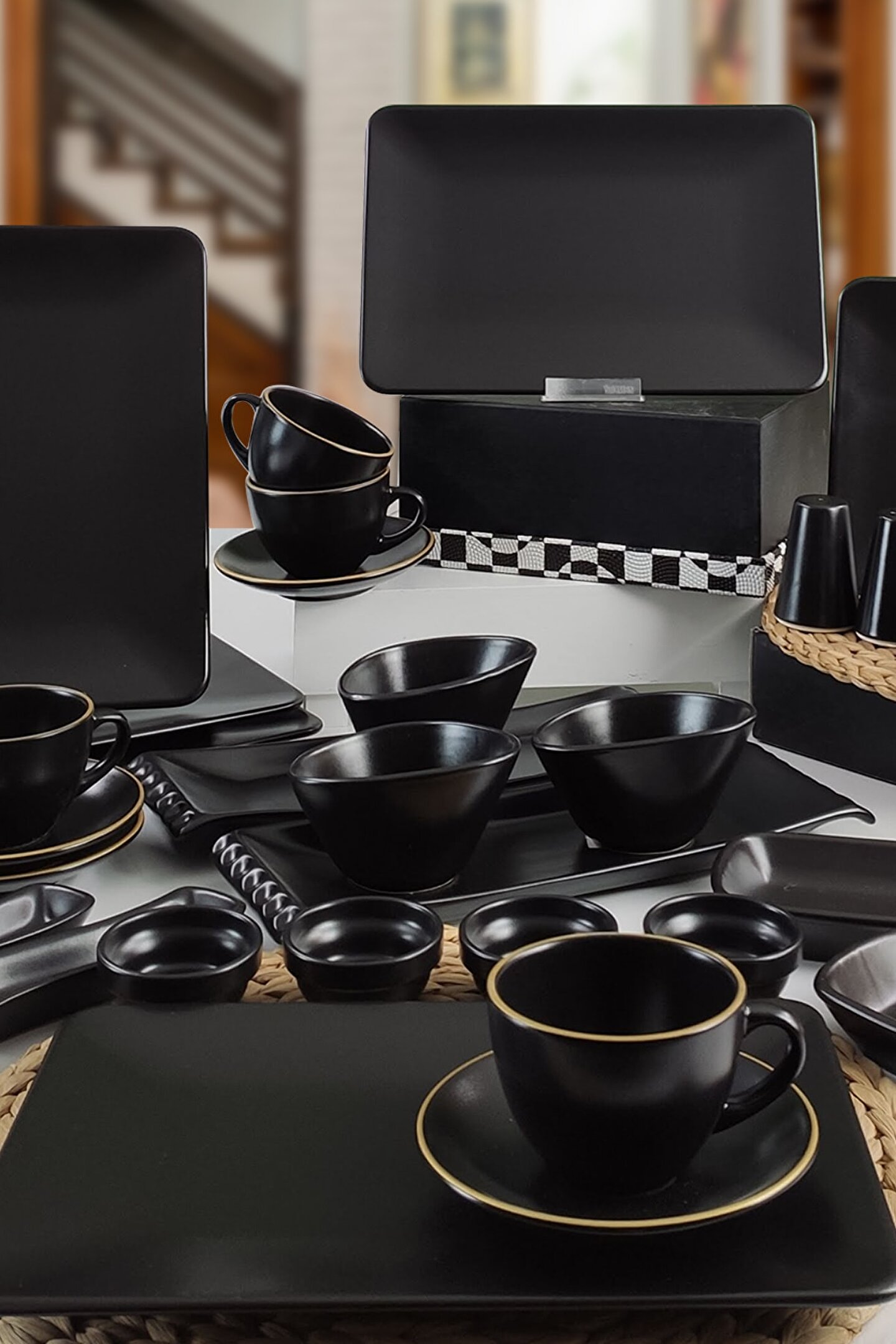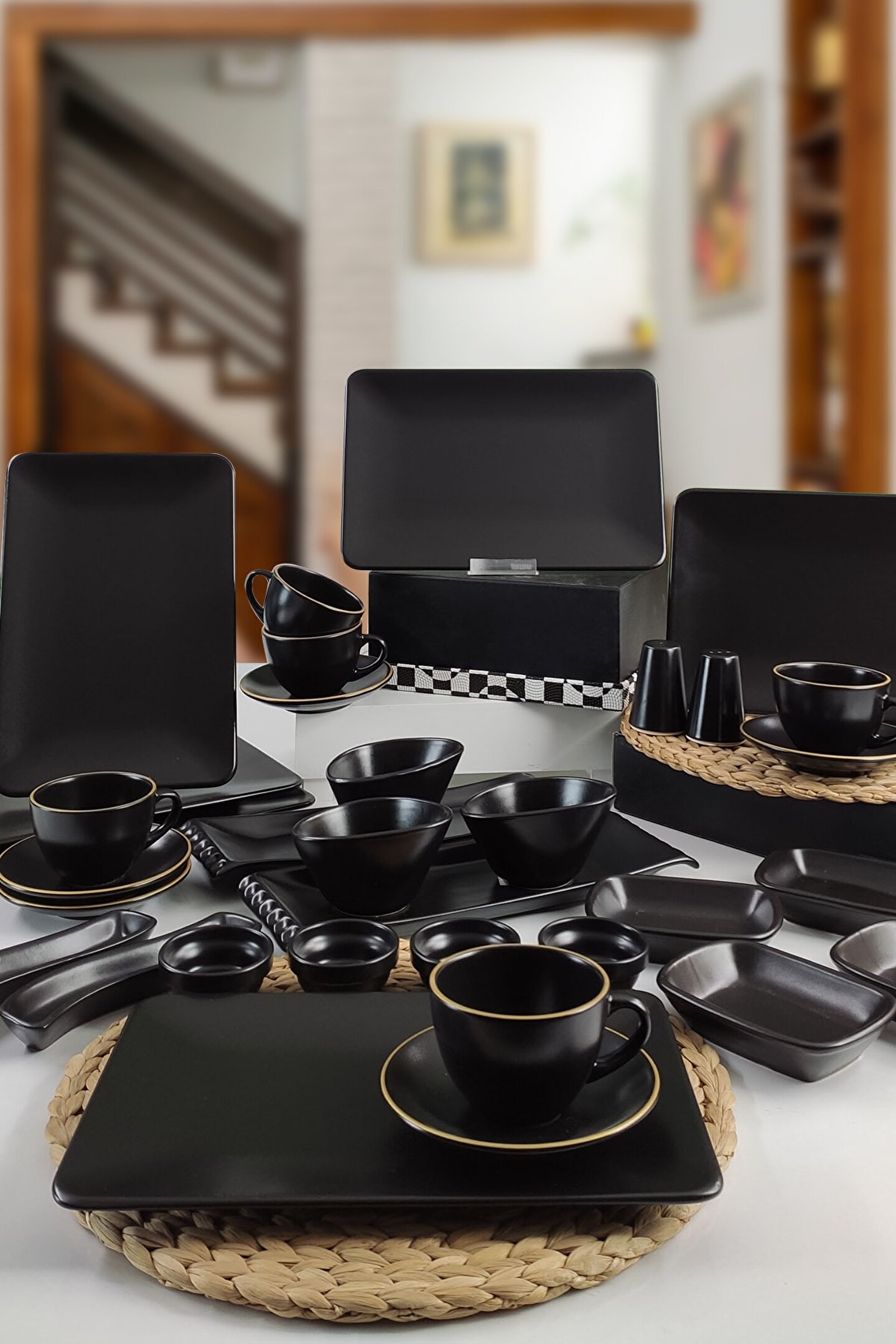 6 adet siyah mat 31*21cm dikdörtgen servis tabağı ; 6 adet siyah mat altın yaldızlı çay fincanı ; 6 adet siyah mat altın yaldızlı çay tabağı ; 4 adet siyah mat 7cm joker kase ; 4 adet siyah mat 13cm dikdörtgen kayık ; 3 adet siyah mat 12cm miska kase ; 2 adet siyah mat ıvory zeytinlik ; 2 adet siyah mat 33cm selen kayık ; 1 adet siyah mat tuzluk ; 1 adet siyah mat biberlik ;