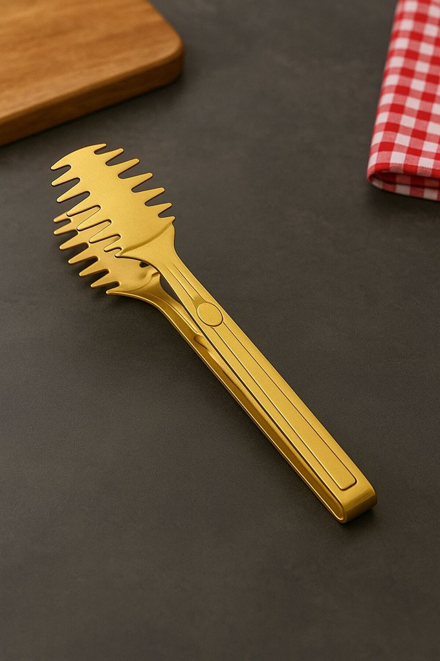 Şık tasarımı ve dayanıklı yapısıyla altın renk paslanmaz çelik makarna servis maşası, mutfağınızda hem estetik hem de pratik kullanım sağlar.; Ergonomik yapısı sayesinde makarnaları kolayca kavrar, kaymadan servis etmenize yardımcı olur.; Paslanmaz çelikten üretildiği için uzun ömürlüdür ve kolay temizlenir.; Modern mutfaklarda sofranıza zarif bir dokunuş katar.; ⸻ ✅ Ürün Özellikleri: • Malzeme: Paslanmaz çelik • Renk: Altın • Kullanım Alanı: Makarna, spagetti ve erişte servisi • Dayanıklı ve uzun ömürlü • Ergonomik tasarım, kolay kavrama • Bulaşık makinesinde yıkanabilir
