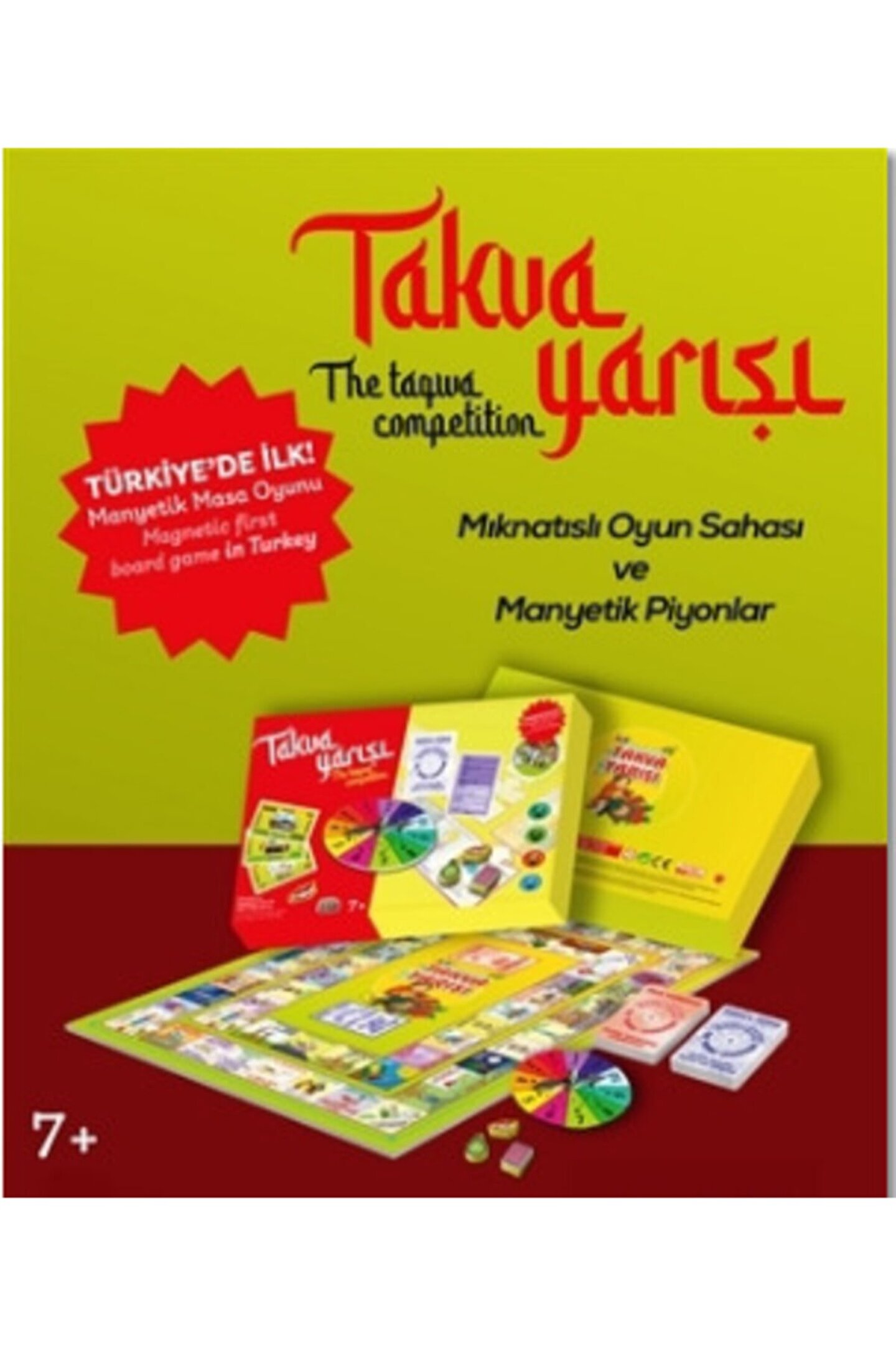 Takva Yarışı Manyetik Masa Oyunu (Türkçe - İngilizce) Kitapborsası Yayıncılık Ebat: 43 x 32; Barkod: 8698553480008; Çıkış Tarihi: 2021; İçerik; Mıknatıslı Oyun Sahası ve Manyetik Piyonlar Açıklama: Takva yarışı oyunculara dinimizin öngördüğü ibadetleri ve iyi davranışları sevdirmek öğrenmek ve aynı zamanda kötü davranışlardan da uzak durmalarını sağlayacak bir grup oyunudur.; Oyuncu cennet'e girmeye vesile olan bazı davranışları oyun sayesinde öğrenmiş olacaktır.; Ayrıca ibadetlerin yanında ders çalışmak diş fırçalamak yalan söylememek arkadaşlarıyla iyi geçinmek emanet riayet etmek israf etmemek gibi iyi davranışlar konusunda da bilinçlenmiş alacaktır.; Oyun İngilizce desteklidir oyuncu kelimelerin İngilizce karşılığını öğrenmiş olacaktır.; *Zararsız yeni versiyondur.