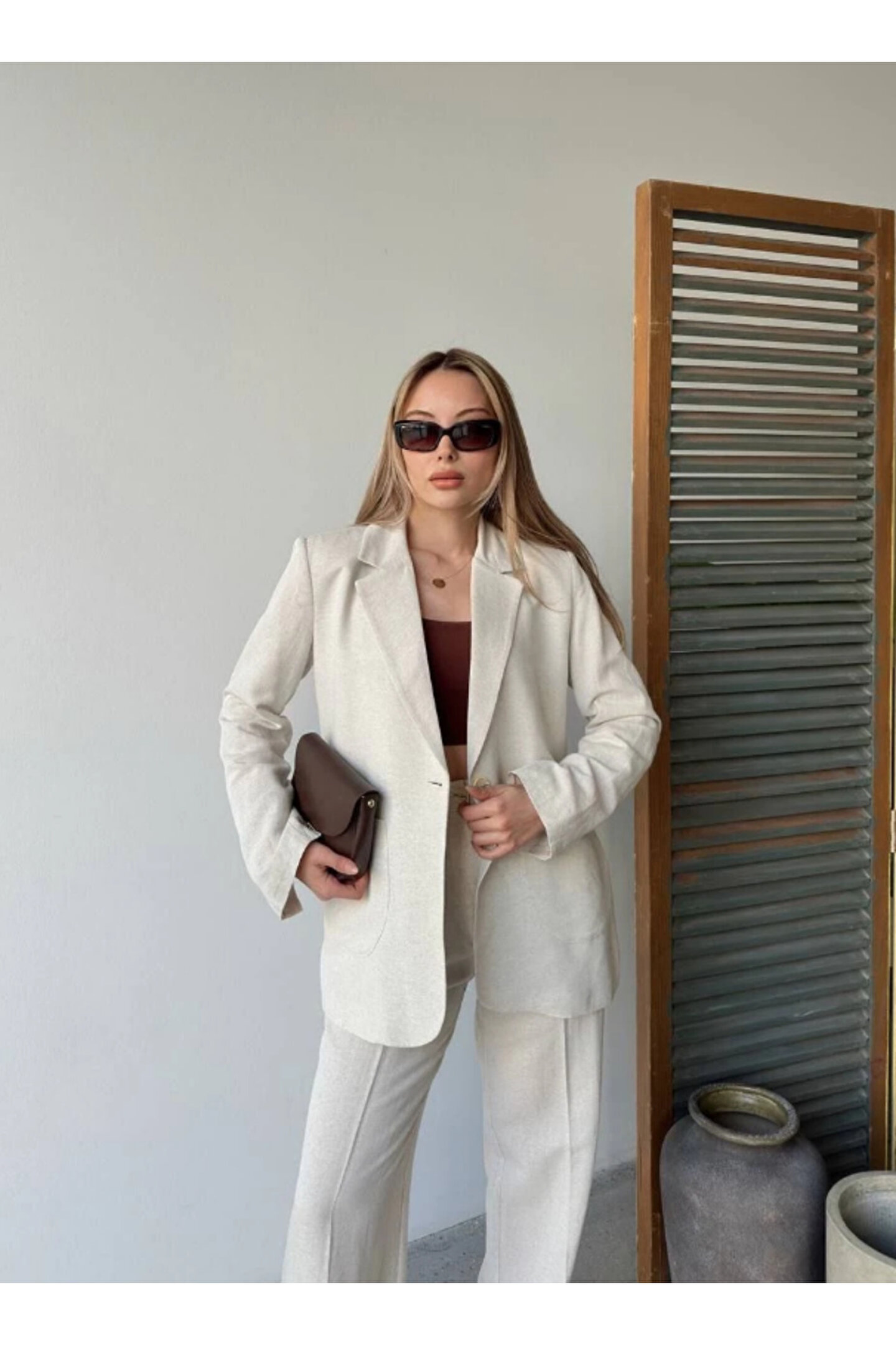 Kiversa Collection Keten Ceket Pantolon İlik Düğmeli Uzun Kollu Yırtmaçlı ikili Takım - Beyaz