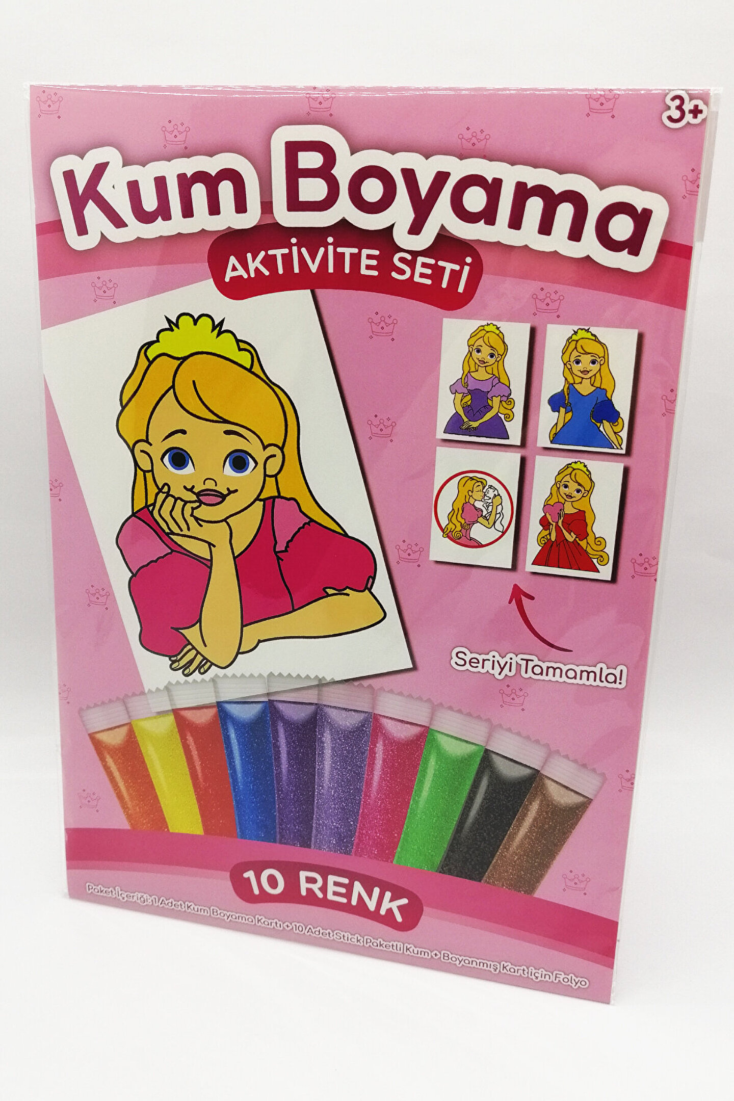 Kum Boyama : Kendinden yapışkanlı ve resimli kartların, renkli kumlarla boyama tekniğidir.; Kartın üzerindeki resim, bir şablon şeklinde, yarı kesik parçalar halindedir.; Sıra ile parçalar kaldırılarak, her kaldırma işleminden sonra renkli kum serpilmek suretiyle boyama yapılır ve tamamlanır.; 3 yaş üzeri uygundur.; Ürünümüz CE belgelidir.; Ayrıca, Avrupa Oyuncak Standartı EN-71,72,73 e uygundur.; Paket İçeriği : * 1 Adet Kum Boyama Kartı ( 23,5cm x 33,0cm, yaklaşık A4 ).; * 10 Adet ( renk ) şeffaf Stick Paketli Renkli Kum ( yaklaşık 7'şer gram ).; * 1 adet Boyanmış Kart için şeffaf Folyo.; * Kürdan.