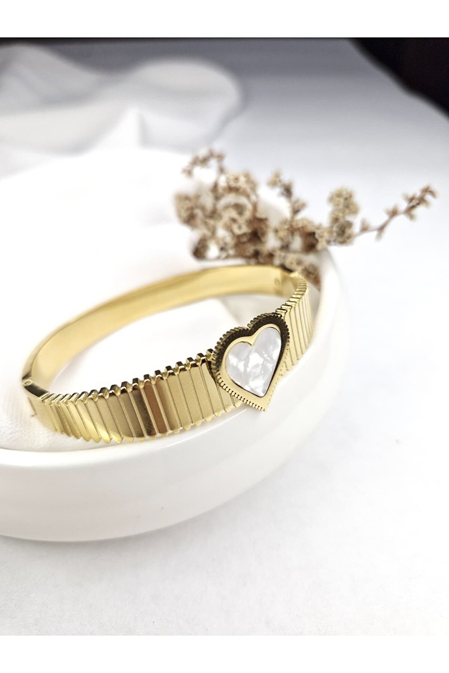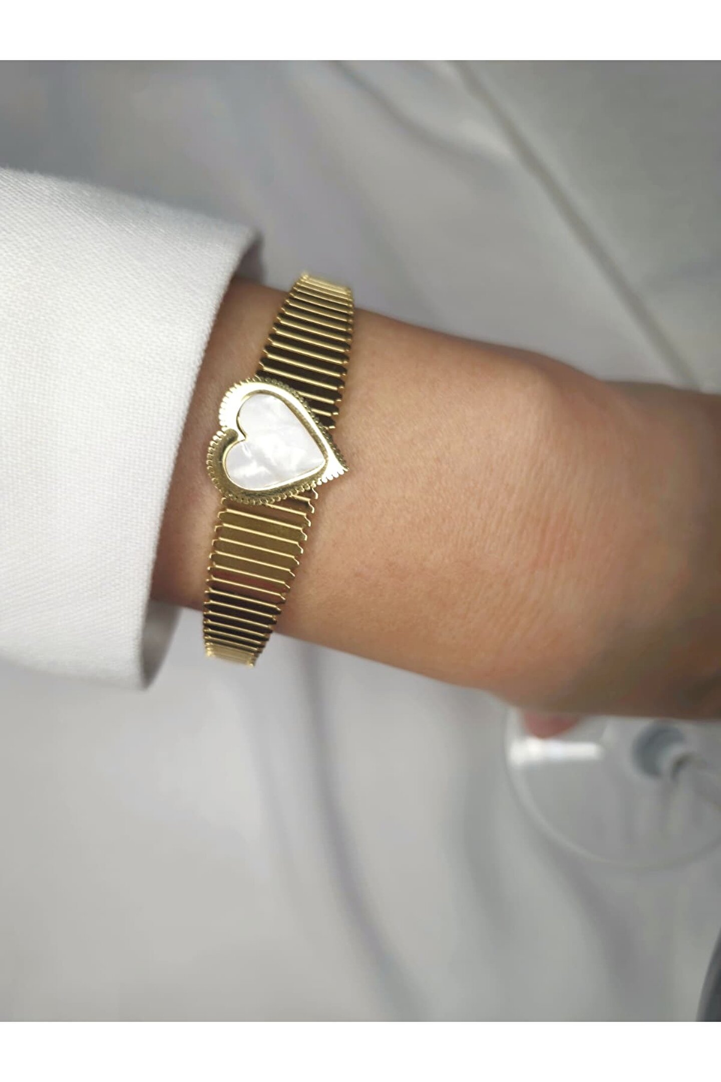 316L paslanmaz çelikten üretilmiştir.; Uzun süre kullanım için parfüm ve deodorant gibi kimyasal ürünlerden uzak tutmanız tavsiye edilir.; Zarif tasarımıyla dikkat çeken altın rengi kalp detaylı bileklik, hem şık hem de anlamlı bir aksesuar arayanlar için özel olarak tasarlanmıştır.; Günlük kombinlerinize minimal ve modern bir dokunuş katarken, özel günlerde zarif bir parıltıyla stilinizi ön plana çıkarır.;