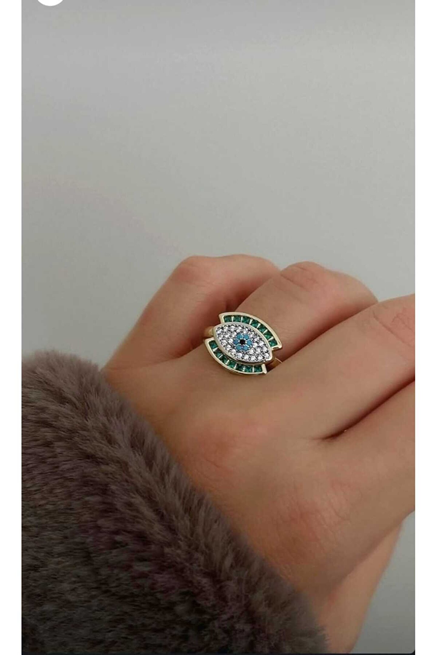 Günlük ve özel günler için ideal bir üründür.; Zirkon taşlarla süslenmiş göz motifli bu yüzük, zarif ve modern bir görünüm sunar.; Ayarlanabilir mekanizması sayesinde her parmak ölçüsüne uygundur.; Uzun süre kullanım için parfüm ve deodorant gibi kimyasallardan uzak tutulması tavsiye edilir.;