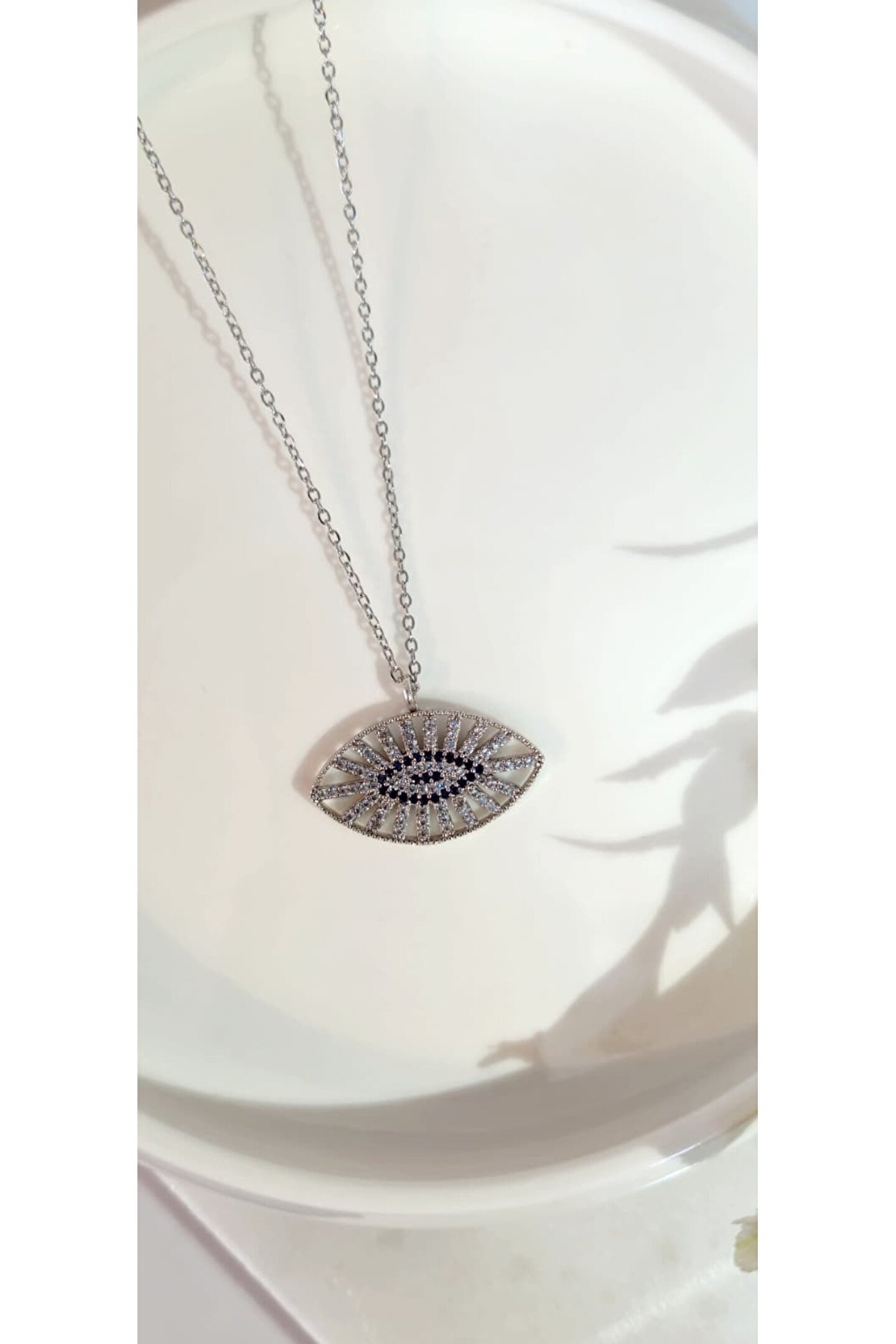 316L Paslanmaz çelikten üretilmiştir.; ; Uzun süre kullanılabilir, kararma yapmaz.; ; Hassas ciltler için uygundur.; ; Göz ( nazar boncuğu veya göz sembolü ) tasarımlı ışıltılı kolye ucuna sahiptir.; ; Beyaz ve lacivert zirkon taşların birleşiminden oluşan kolye, şık ve zarif bir görüntü sunacaktır.; ; Göz figürü, genellikle koruyucu, nazardan sakınma ve şans getirme anlamı taşır.; ; Özel bir bakım gerektirmez.; ;