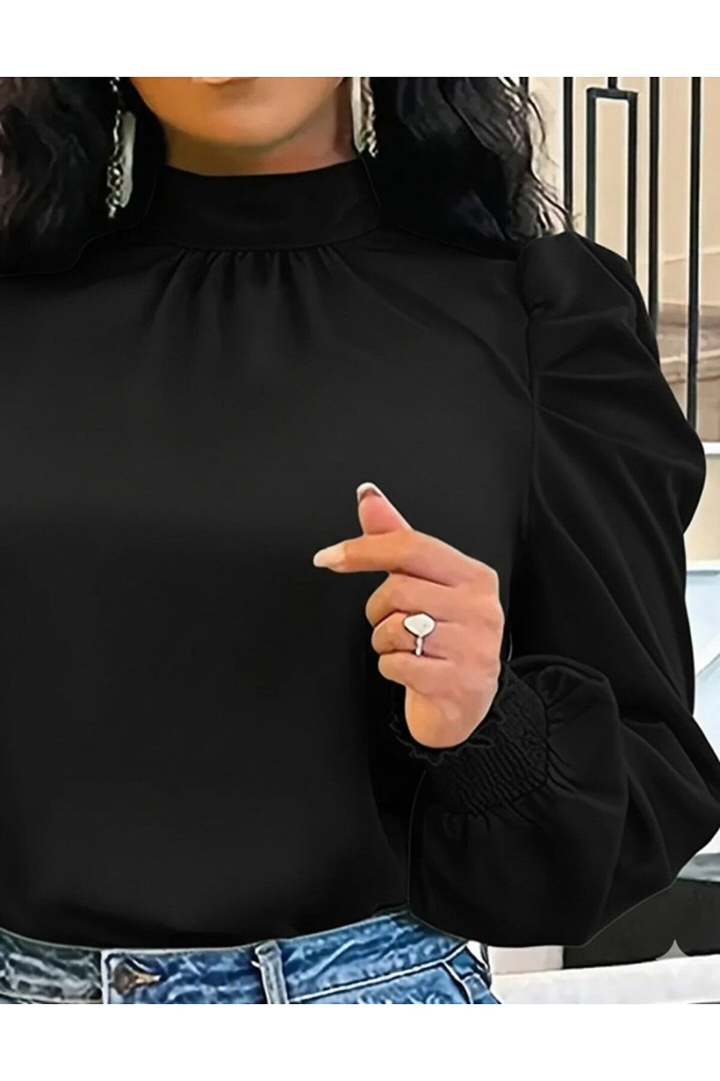 Kadın Uzun Kollu Balıkçı Yaka Arkadan Bağlamalı Omuzlardan Balon Ithal Krep Bluz