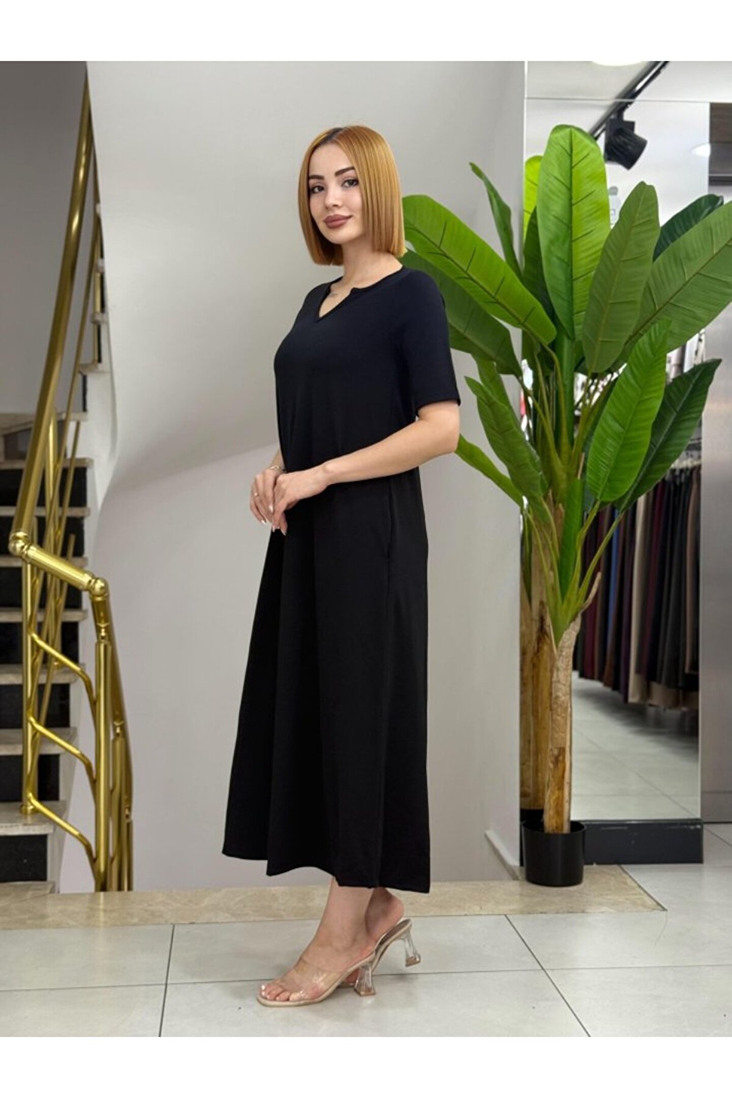 Kadın Kısa Kollu V Yakalı Cep Detaylı Uzun Janjan Krep Elbise