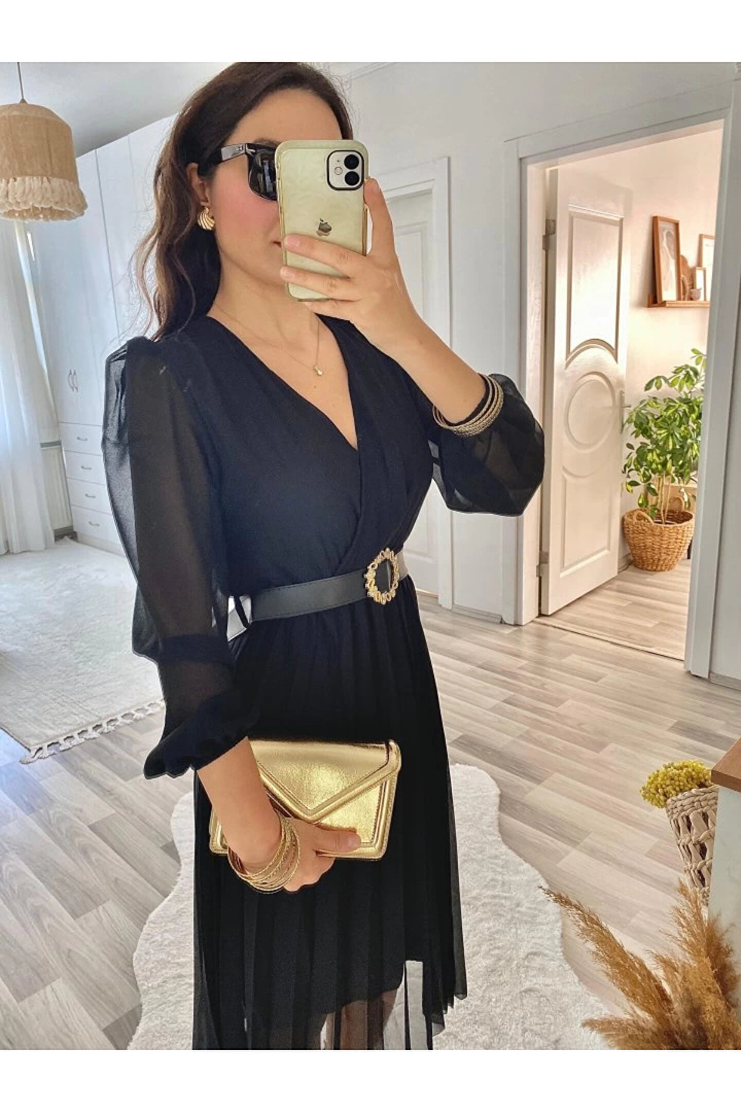 Kadın şifon Kumaş Astalı Kloş Kesim Kruvaze Yaka Midi Boy Elbise