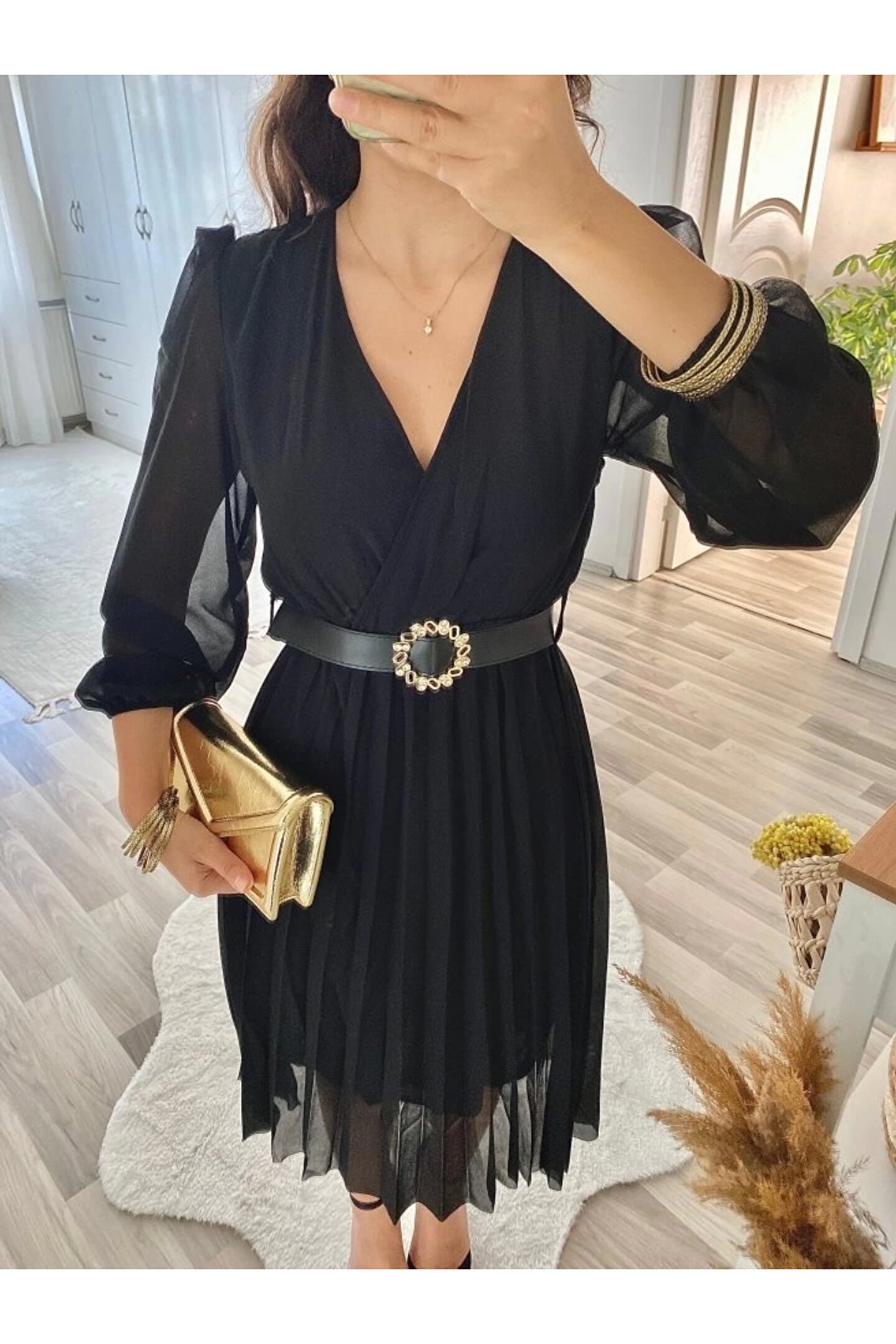 Lady Moss MDB Kadın şifon Kumaş Astalı Kloş Kesim Kruvaze Yaka idi Boy Elbise