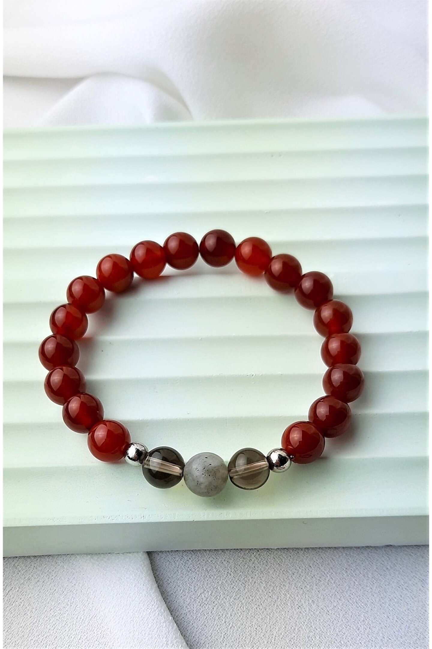 Doğal taş kullanımı sayesinde her bileklik benzersiz ve özgün bir görünüm sunar; Akik ve dumanlı kuvars gibi değerli taşlar, bilekliğe şık bir dokunuş katar; Doğal taş materyali ile hem dayanıklılık hem de estetik bir parlaklık sağlar; Özel günlerde sevdiklerinize anlamlı ve kalıcı bir hediye alternatifi olarak tercih edilebilir;