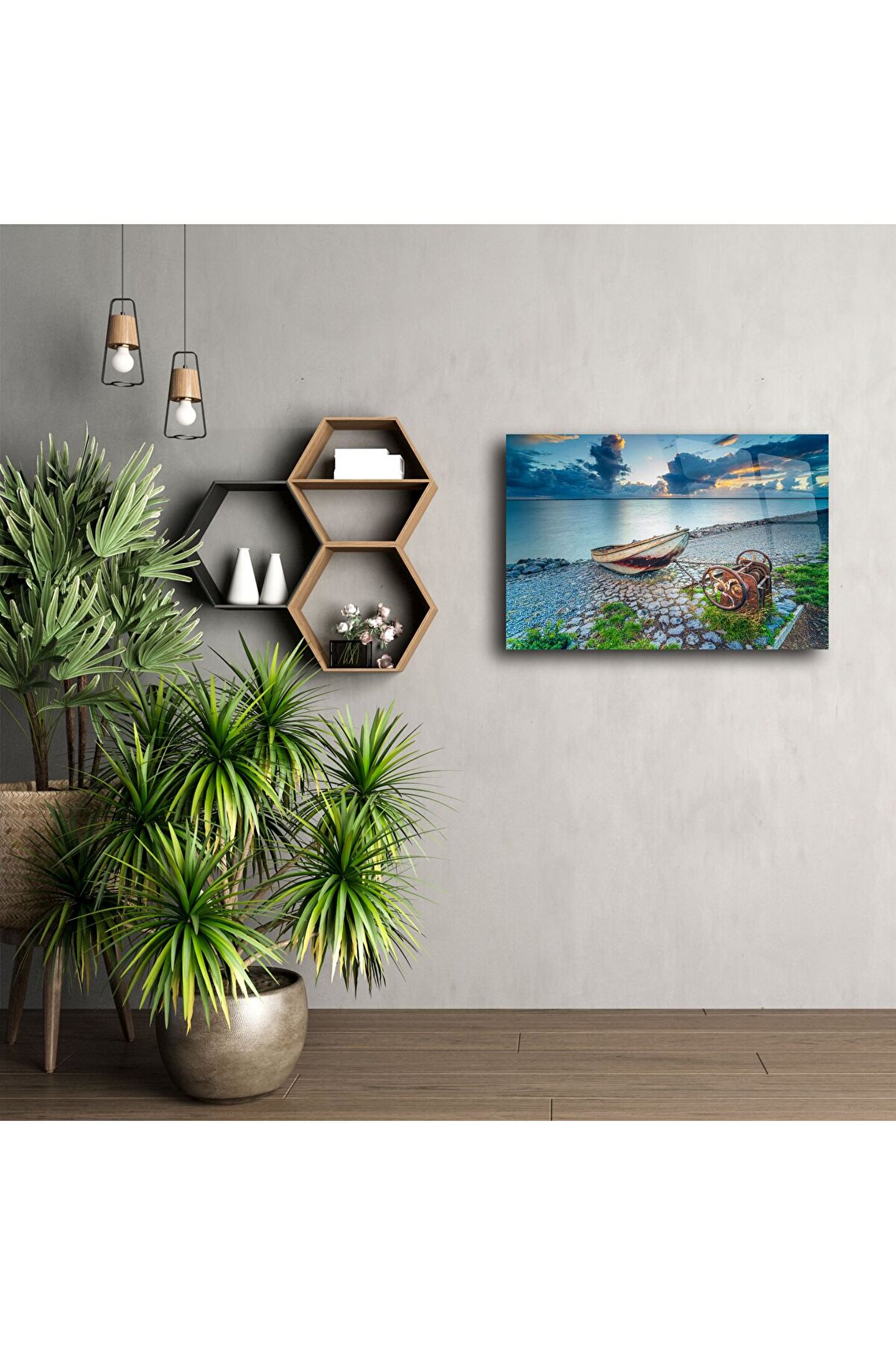 Doğanın huzur verici tonlarını yansıtan bu çarpıcı cam tablo, paslanmış kayık ve gökyüzünü delen bulutlarla dolu dramatik bir günbatımını gözler önüne seriyor. Kristal netliğindeki temperli cam yüzey üzerine yüksek çözünürlükte basılan bu eser, modern yaşam alanlarına sofistike bir karakter katar. Kayalık sahil, nostaljik zincir ve sanatsal dokunuşlarla birleşerek duvarınıza adeta bir hikâye fısıldar.