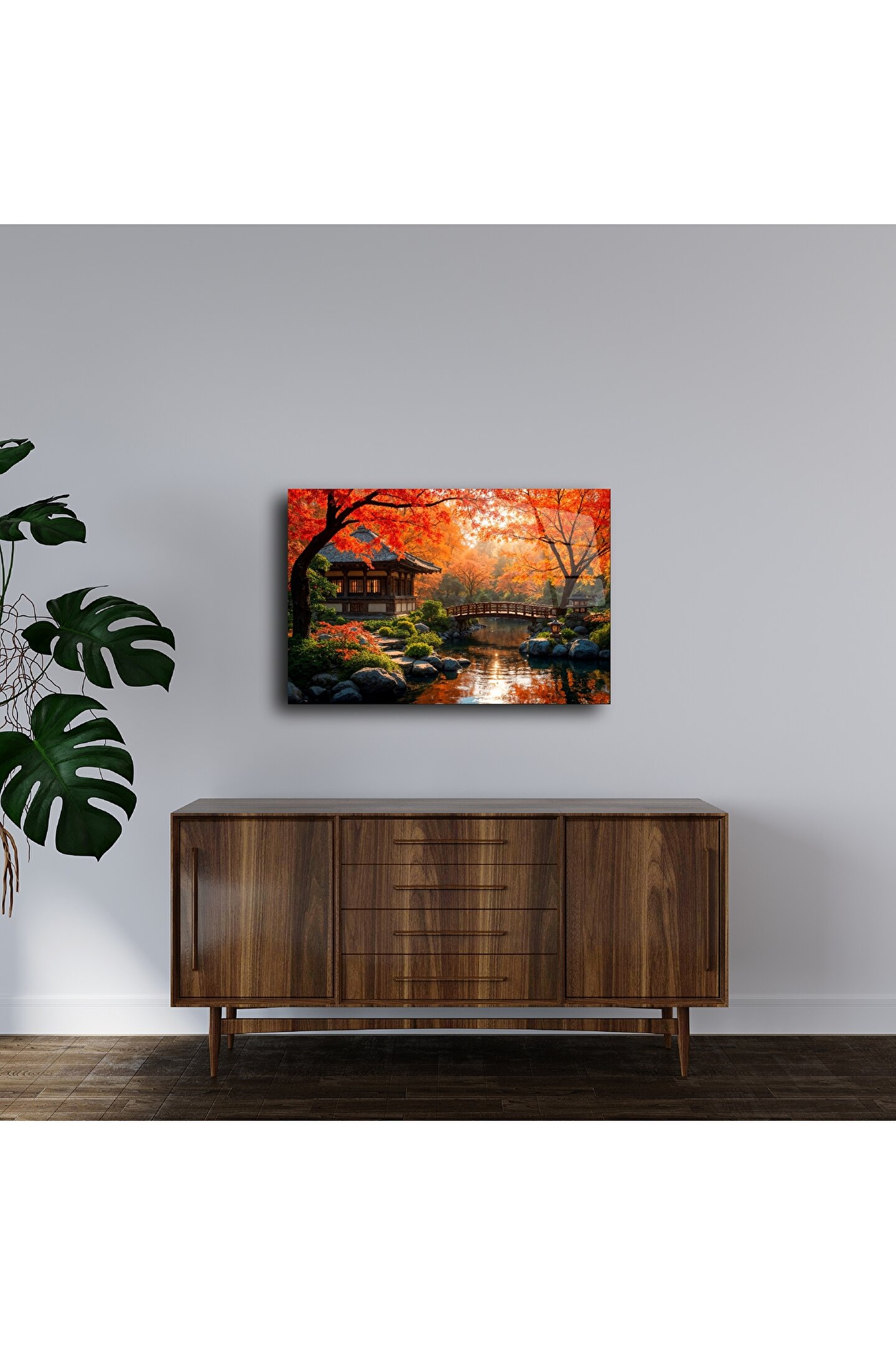 Bu büyüleyici Japon bahçesi cam tablo, doğu felsefesinin dinginliğini ve estetiğini evinize taşıyor. Parlak kırmızı akçaağaç yaprakları, taş köprü ve geleneksel tapınak detaylarıyla çevrili bu manzara, huzurun ve zarafetin kusursuz bir birleşimini sunar.