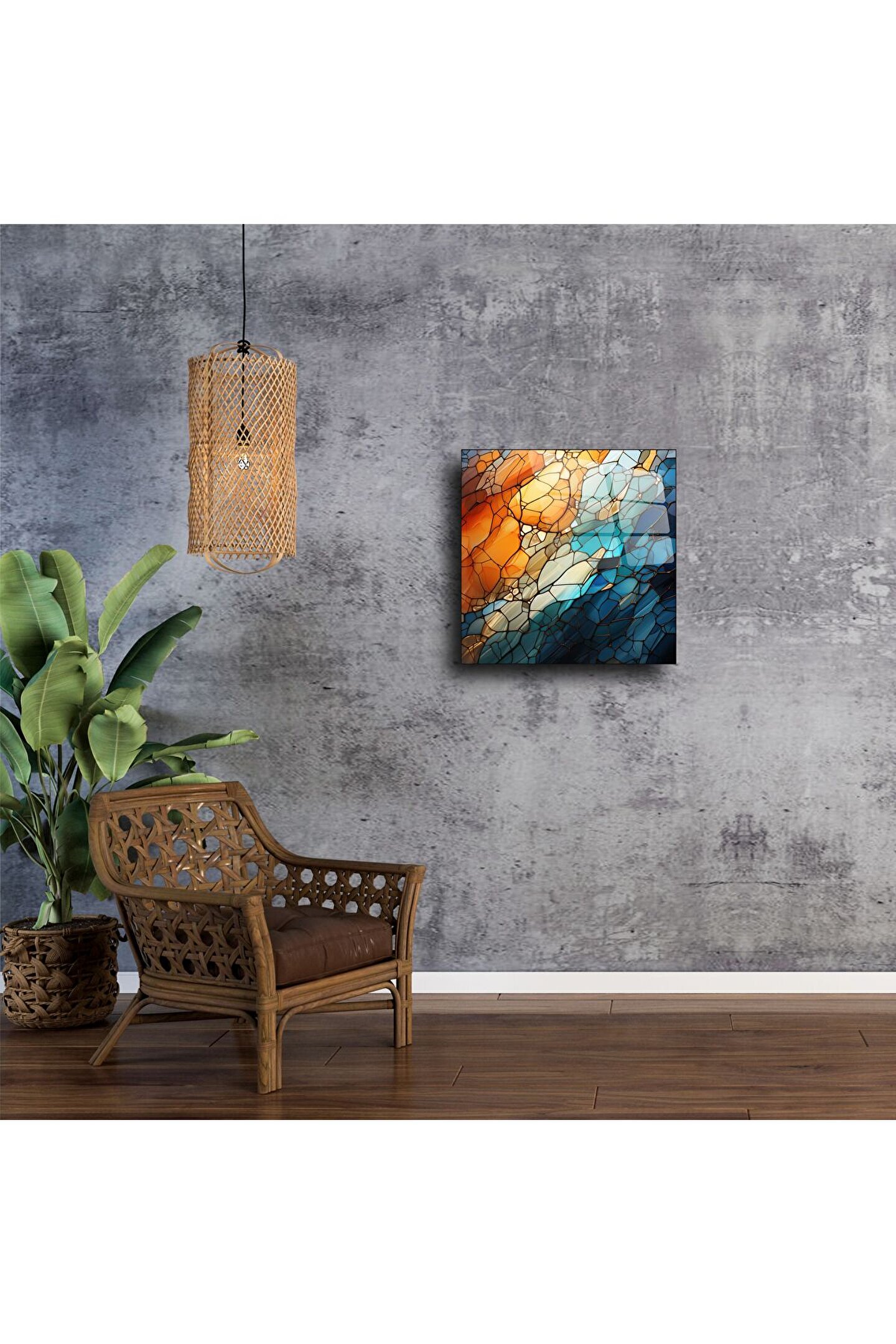 Modern sanatı yaşam alanınıza taşıyan bu soyut cam tablo, dinamik turuncu ve mavi tonların armonisiyle tasarlanmıştır. Renk geçişleriyle derinlik hissi yaratan bu cam panel, minimalist çizgilerle çağdaş bir atmosfer sunar.