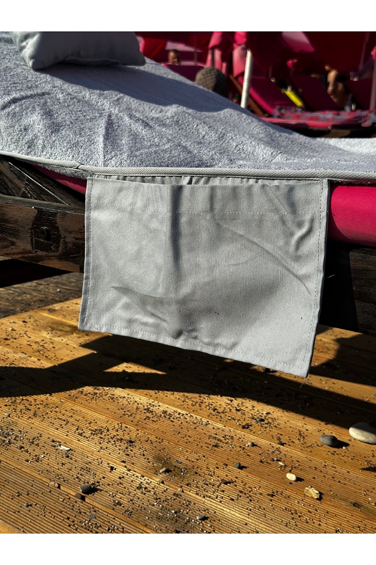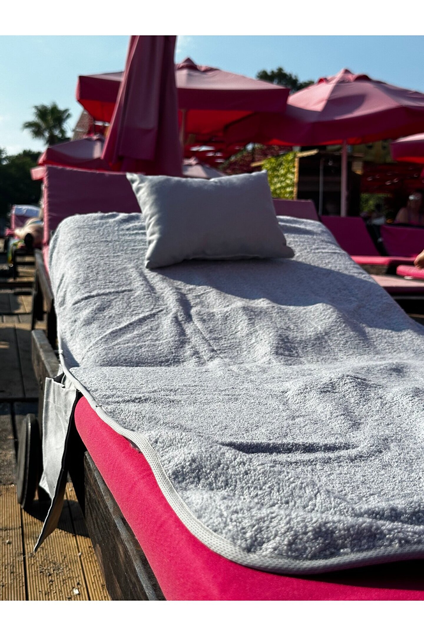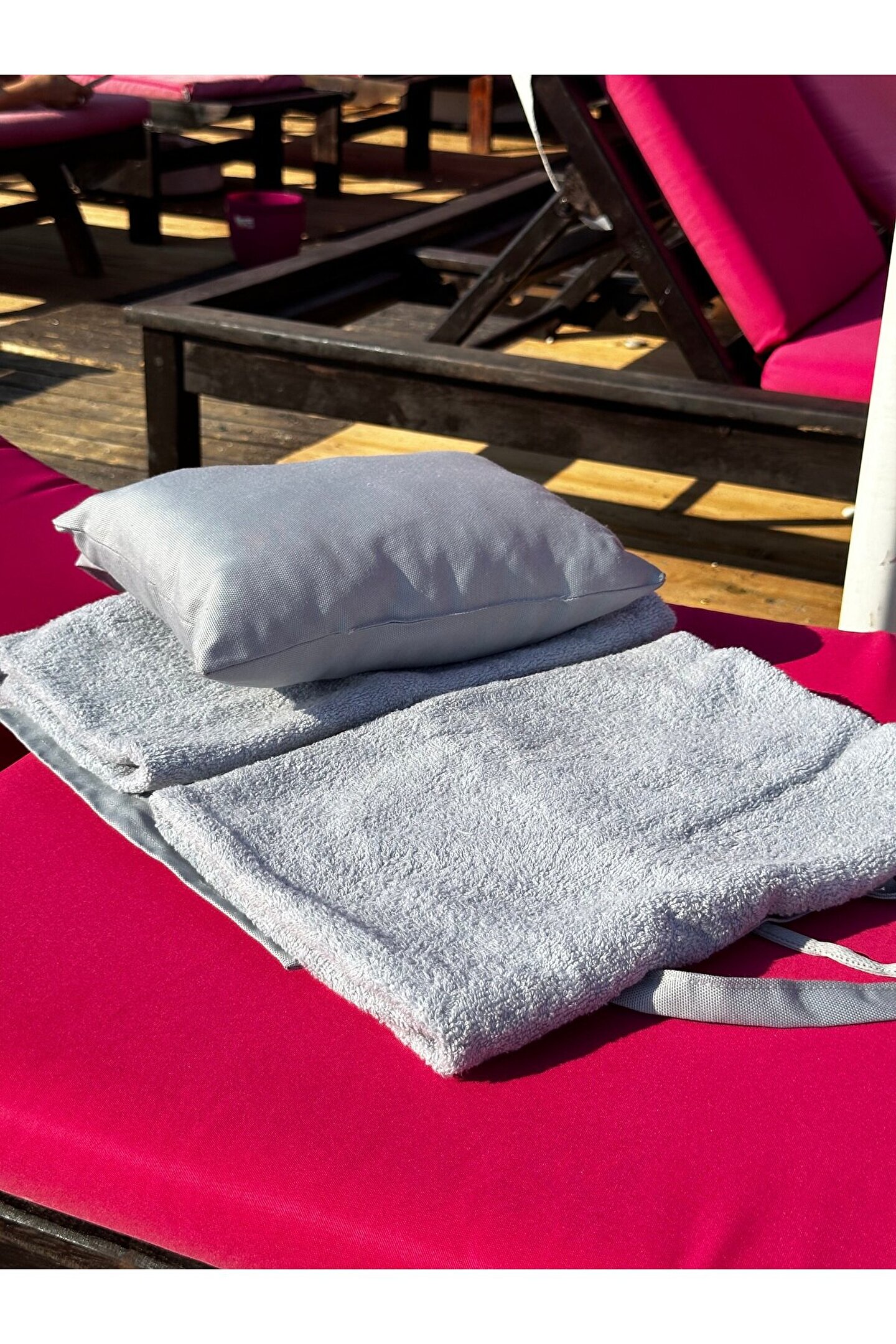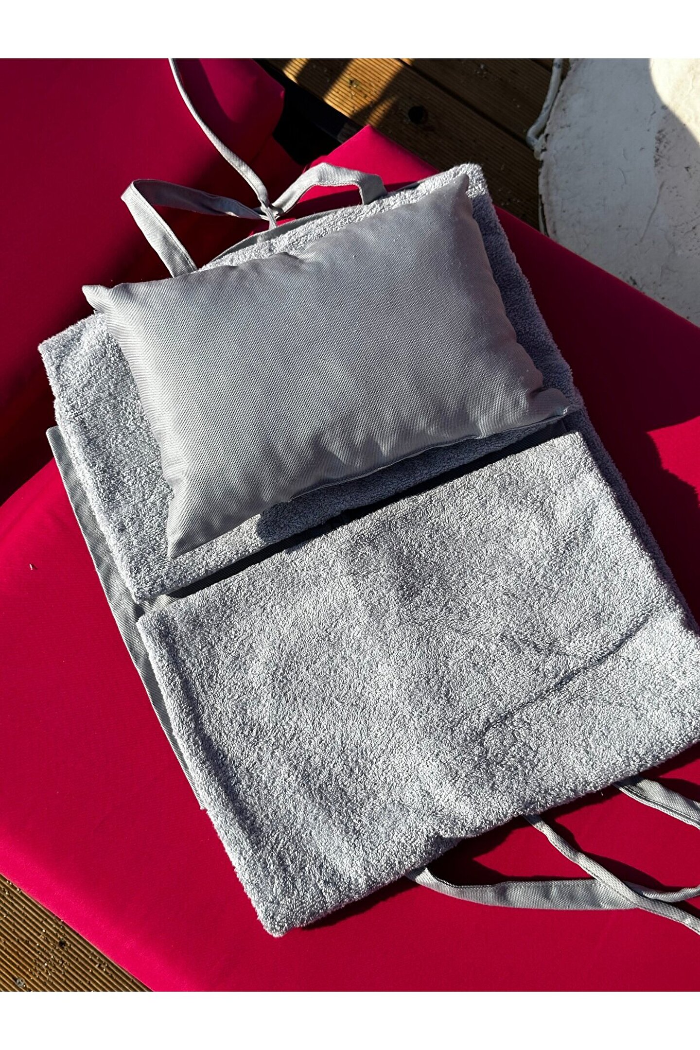 Çanta formunda plaj havlusu Ürün içerisinde yastığı ile gönderilmektedir. ; Ürünün çanta formunda iken 4, açık formda iken de 4 cebi bulunmaktadır. ; Ceplerde cüzdan, telefon, anahtar, kitap gibi bütün özel eşyalarınızı rahatlıkla muhafaza edebilirsiniz. ; Şezlonga sabitlemek için ipi bulunmaktadır. ; Aynı zamanda içinden çıkan yastık rüzgardan uçmaması ve kolay kullanım için istendiğinde düğme ile sabitlenebilmektedir. ; Çamaşır makinasında yıkamaya uygundur. ; Ürün üzerindeki çanta detayı dikme formdadır. ; Ürün açılıp şezlonga serildiğinde çanta detayı altta kalıp kolay kullanım sağlar. ; 75x175 cm;
