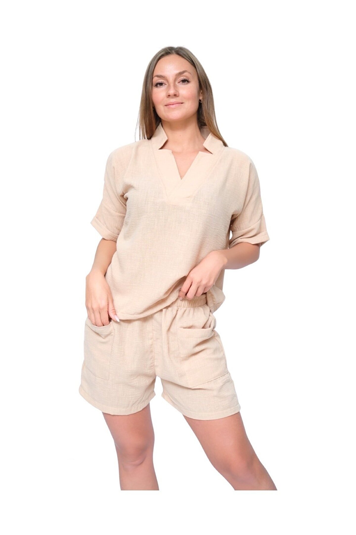 Rahat ve şık bir görünüm için ideal, günlük kullanıma uygun keten t; shirt; şort eşofman takımı; Regular boy kesimi ile her vücut tipine uyum sağlar ve konforlu bir kullanım sunar; İnce yapısıyla hafif ve nefes alabilen kumaşı, sıcak yaz günlerinde serinlik hissi verir; Truvakar kol tasarımı modern ve trend bir görünüm kazandırırken, yarasa kol kesimi hareket özgürlüğü sağlar; Oversize kalıbı sayesinde rahat bir oturuş sunar ve geniş paça tasarımı modern bir siluet oluşturur; Düz deseniyle sade ve zamansız bir stil yaratırken, v yaka detayı ile şıklığı tamamlar; Dokuma kumaş tipi dayanıklılığı arttırarak uzun süreli kullanım imkanı tanır; Beli lastikli yapısı sayesinde kolayca giyilip çıkartılabilir ve mükemmel uyumu garanti eder; Çift cepli tasarım pratiklik kazandırarak küçük eşyalarınız için ekstra alan sunar; Basic koleksiyonun parçası olarak her gardıropta temel;