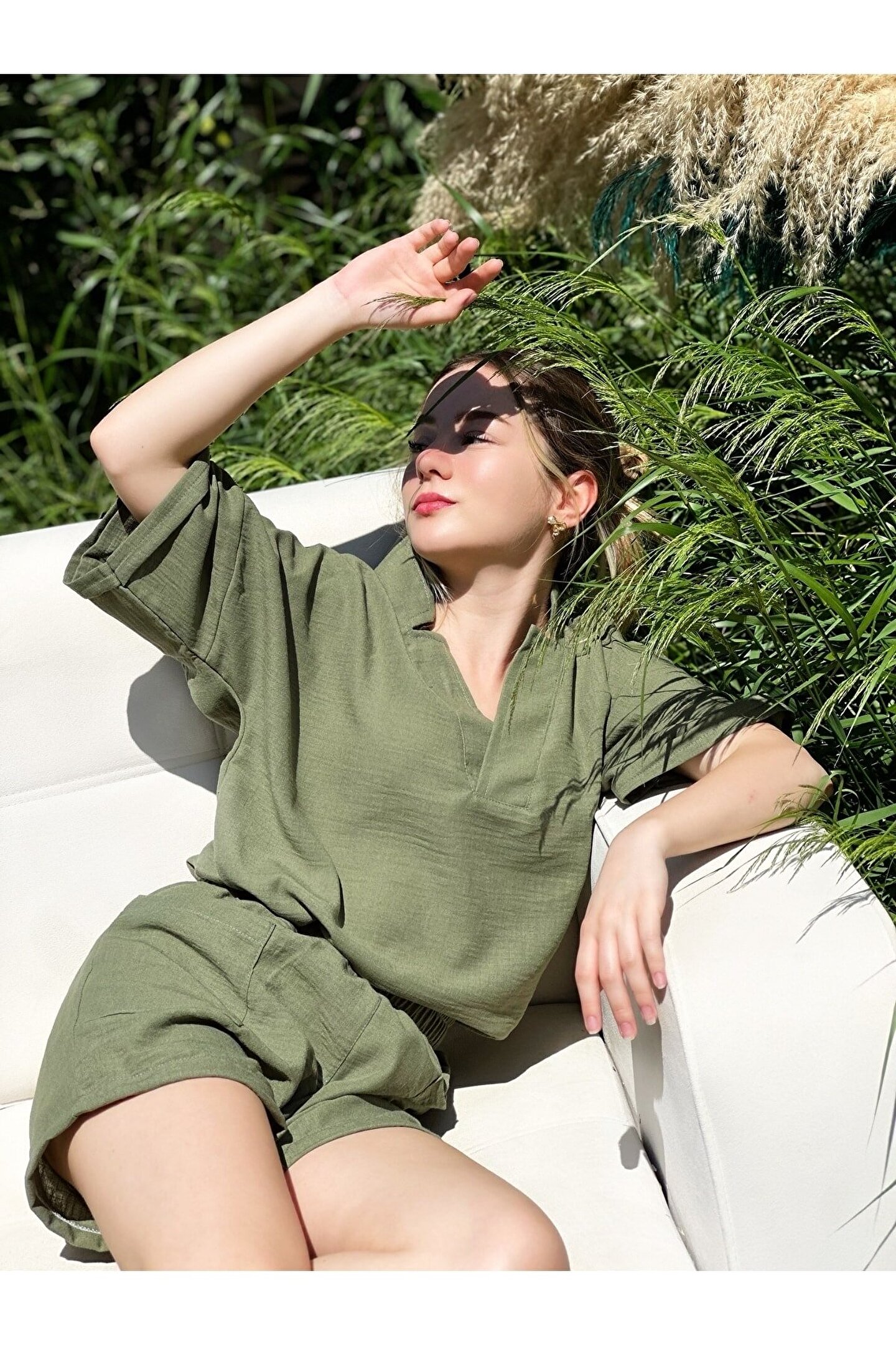 Truvakar kol tasarımı ile modern ve şık bir görünüm sunar; Günlük kullanıma uygun rahatlığı ve konforu bir arada sunan casual tarzda tasarlanmıştır; Dokuma kumaş yapısı sayesinde dayanıklılık ve nefes alabilirlik sağlar; V yaka kesimi ile sade ve zarif bir stil oluşturur; Çift cepli tasarımı pratik kullanım imkanı sunarken, eşyalarınız için güvenli bir alan sağlar; Lastikli bel detayı sayesinde rahat bir oturuş ve hareket özgürlüğü sağlar; Basic koleksiyonun sadeliğiyle her ortama uyum sağlayacak şekilde tasarlanmıştır; Geniş paça kesimiyle modern ve trend bir siluet çizer; Beli lastikli yapısı konforlu bir kullanım sunarken, vücut hatlarını nazikçe sarar; Oversize kalıbı rahatlığı ön planda tutarak geniş ve rahat bir kullanım imkanı tanır; Basic siluetiyle zamansız bir şıklık yaratır; her mevsim tercih edilebilir; Keten materyali hafifliği ve doğal dokusuyla;