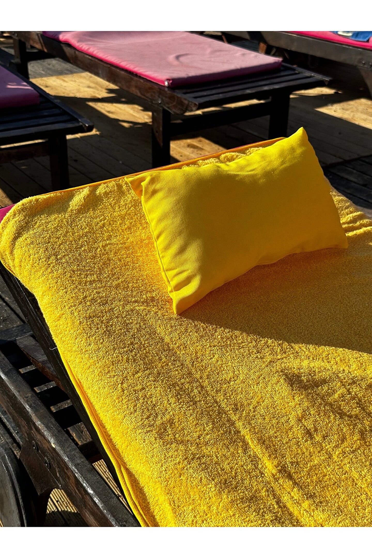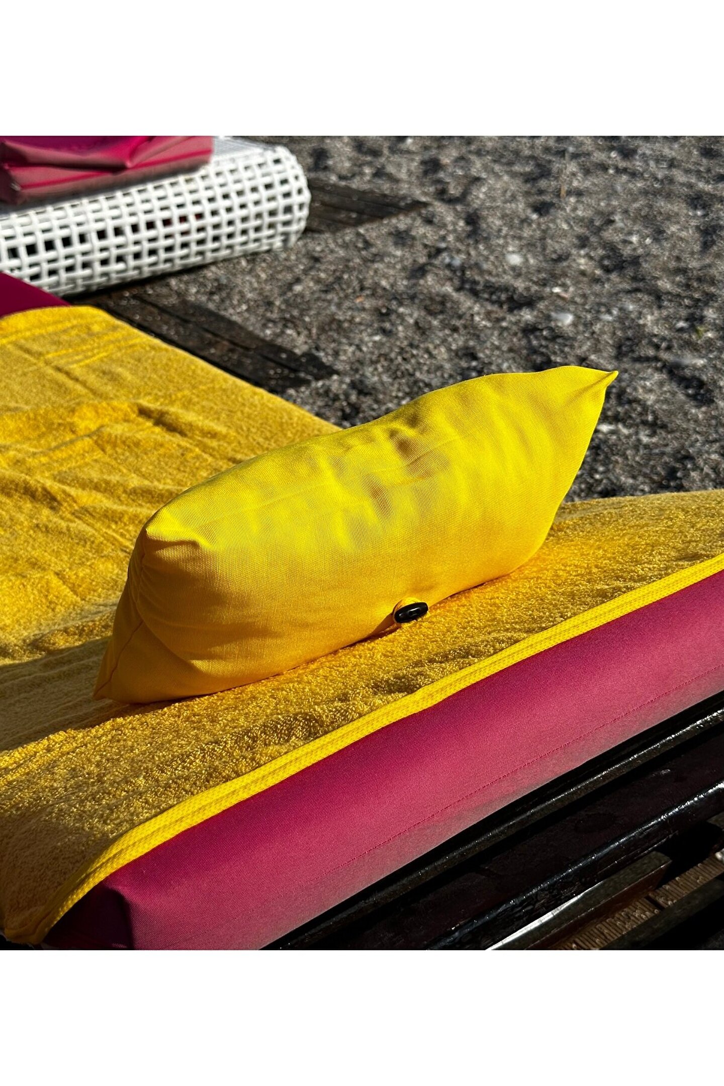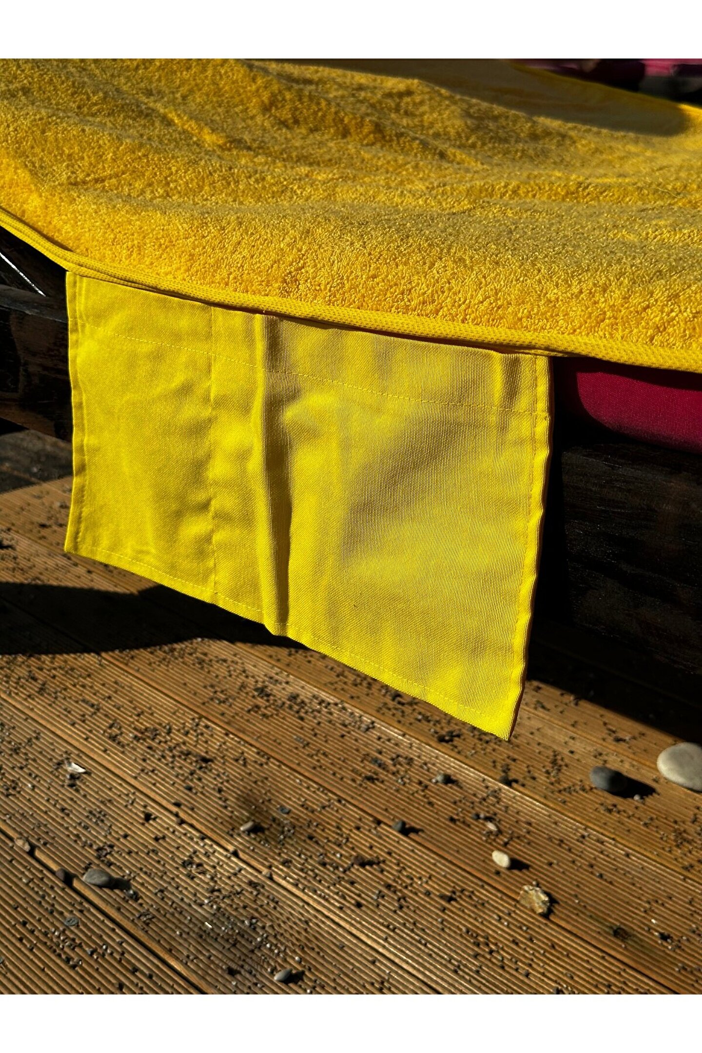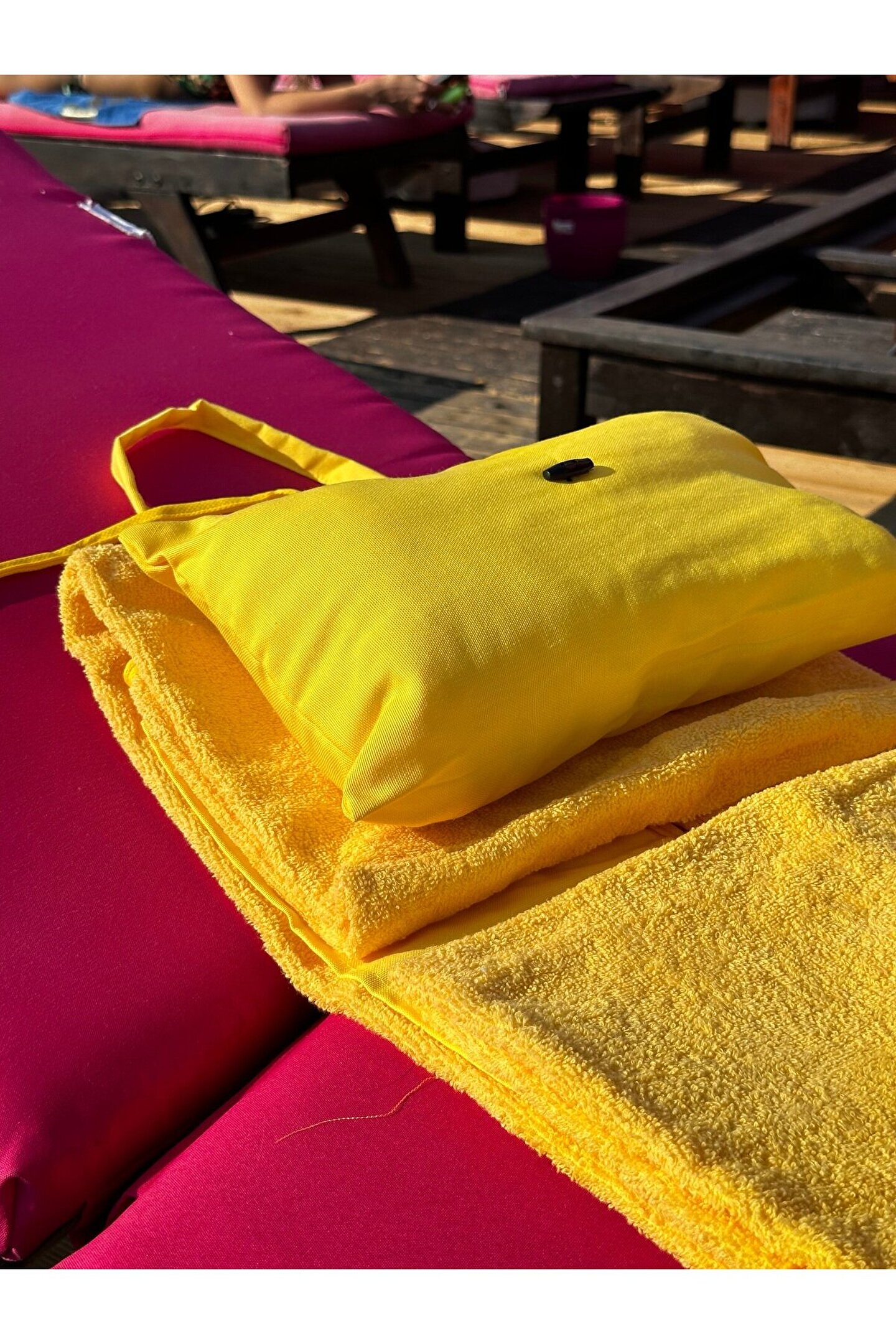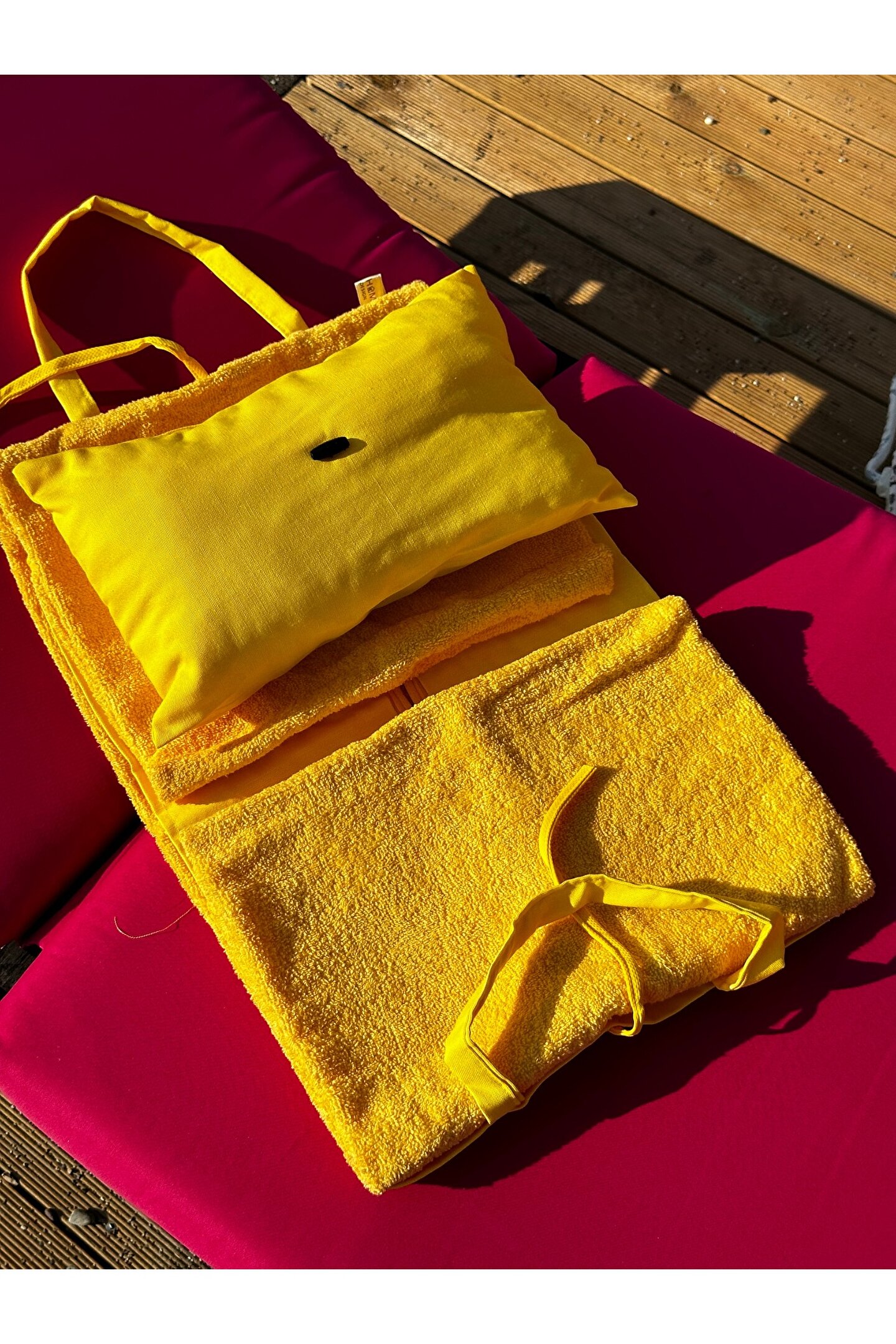 Çanta formunda plaj havlusu Ürün içerisinde yastığı ile gönderilmektedir. ; Ürünün çanta formunda iken 4, açık formda iken de 4 cebi bulunmaktadır. ; Ceplerde cüzdan, telefon, anahtar, kitap gibi bütün özel eşyalarınızı rahatlıkla muhafaza edebilirsiniz. ; Şezlonga sabitlemek için ipi bulunmaktadır. ; Aynı zamanda içinden çıkan yastık rüzgardan uçmaması ve kolay kullanım için istendiğinde düğme ile sabitlenebilmektedir. ; Çamaşır makinasında yıkamaya uygundur. ; Ürün üzerindeki çanta detayı dikme formdadır. ; Ürün açılıp şezlonga serildiğinde çanta detayı altta kalıp kolay kullanım sağlar. ; 75x150 cm;
