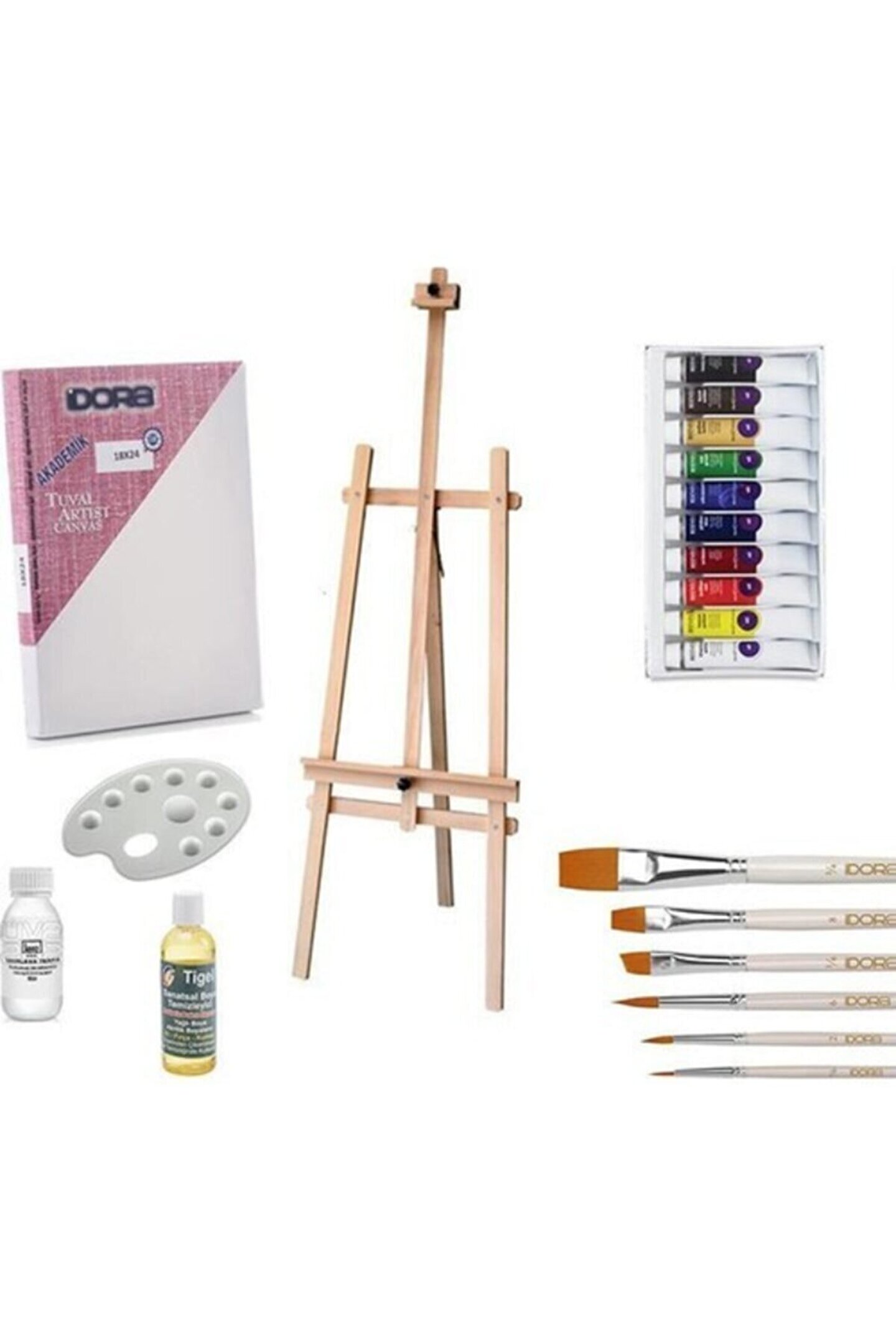 1 adet 3 ayaklı şövale.; ; 12li yağlı boya takımı.; ; 6 adet yağlı boya fırçası.; ; 35x50 tuval .; ; Palet.; ; Kokusuz terebentin.; ; Fırça temizleyici.; ; Yağlı Boya Başlangıç Seti Ahşap Şövale 175 cm Boyanabilir Verniklenebilir