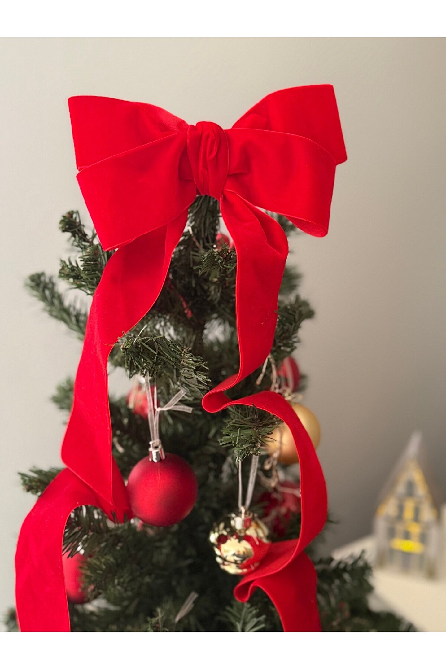 Lovein Atelier Büyük Kırmızı Kadife Fiyonk Kurdele Ağaç Süsü Yeni yıl,Yılbaşı,Dekor