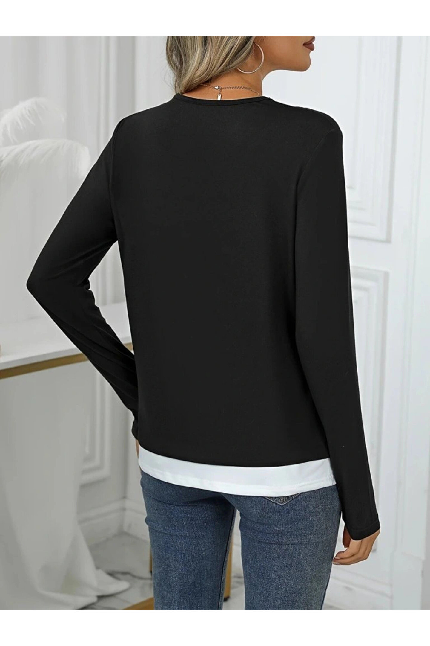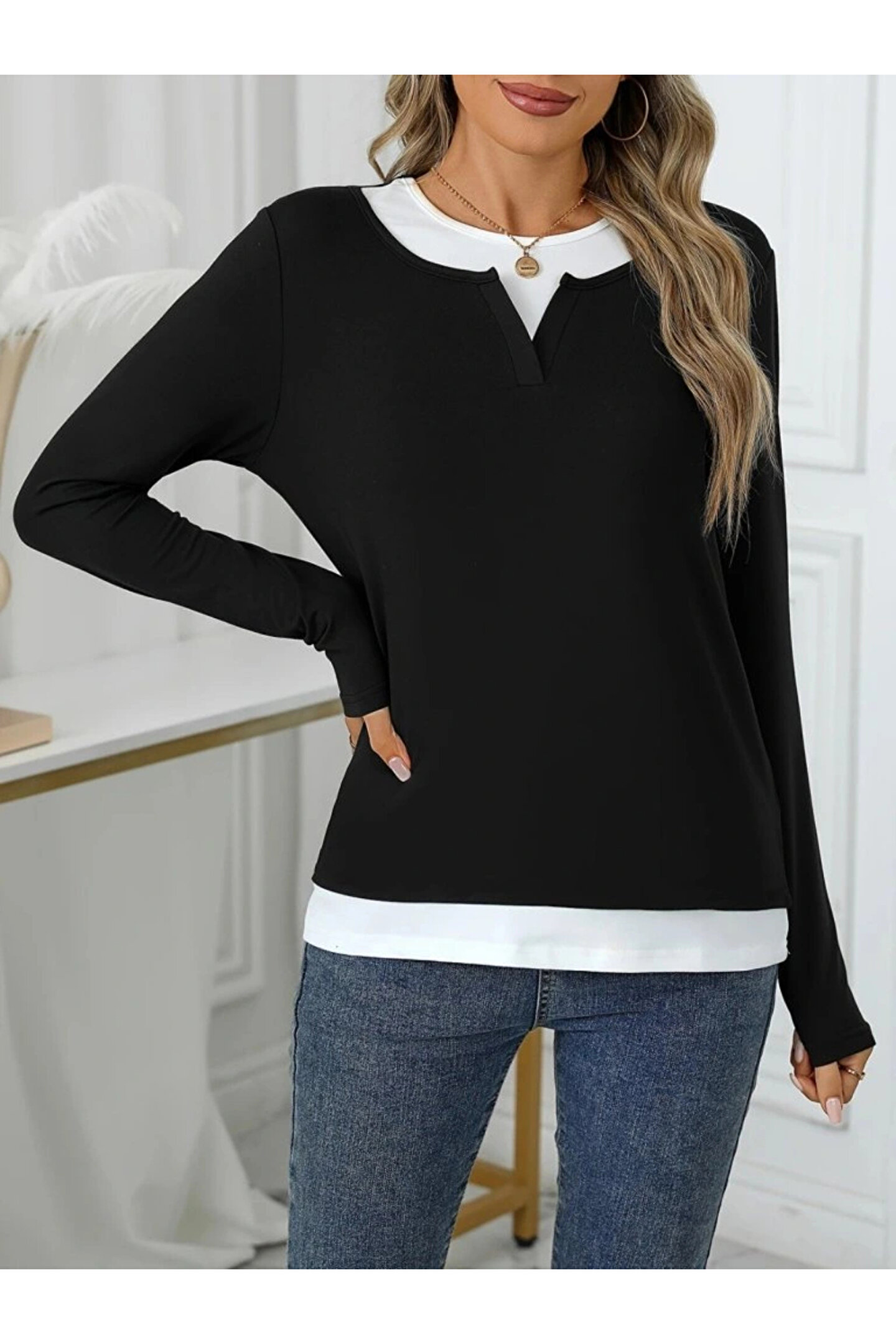 Kadın Uzun Kollu V Yakalı çift Renkli Viskon Iki Iplik Bluz