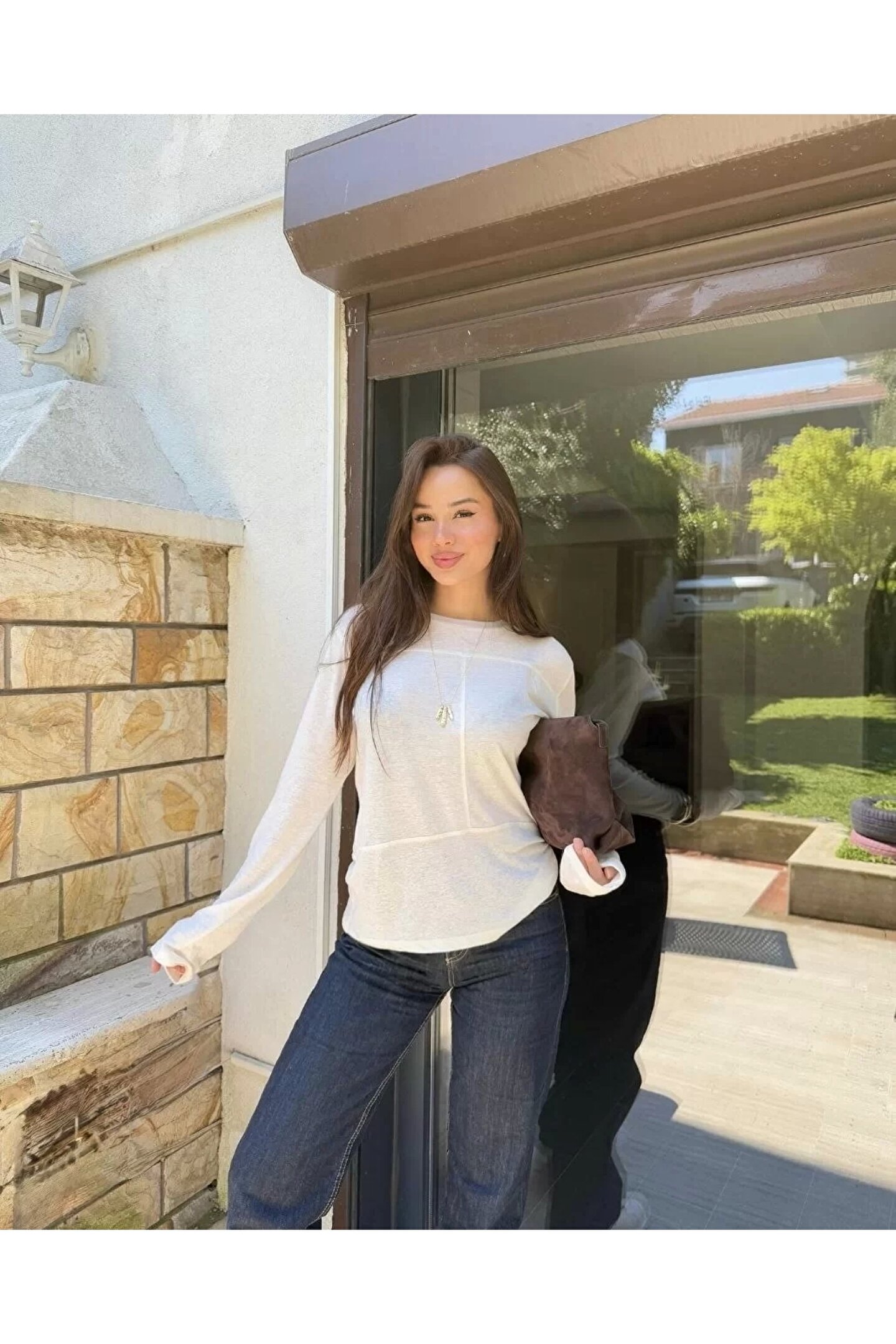 LUMİART Bisiklet Yaka uzun Kollu Bluz - Beyaz