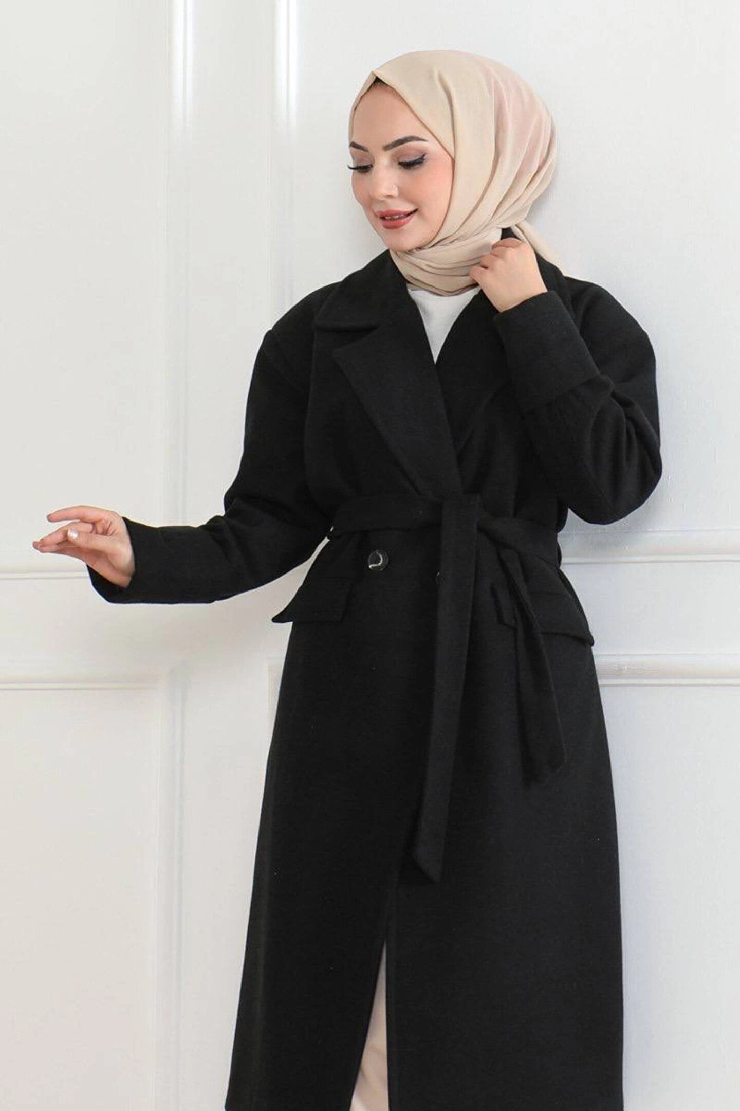 Lunvare Premium Kadın Düğmeli İçi Astarlı Kaşmir Kaşe Kaban - Siyah