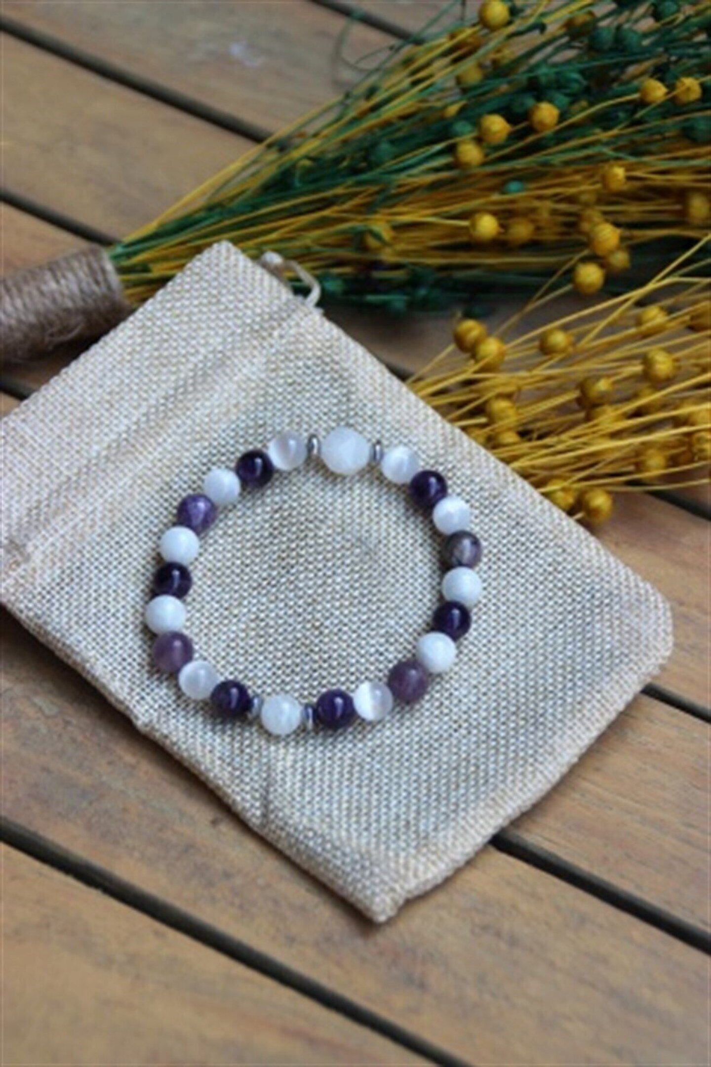 Mavera Doğaltaş Ay Taşı - Ametist - Selenit Doğal Taş Bileklik 8 mm