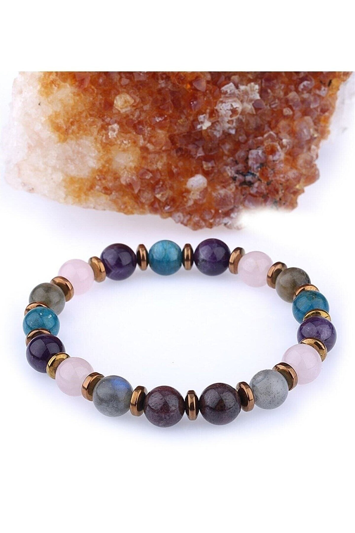 Mavera Doğaltaş Lal Pembe Kuvars Hematit Labrodite Ametist Apatit Doğal Taş 8 mm Bileklik
