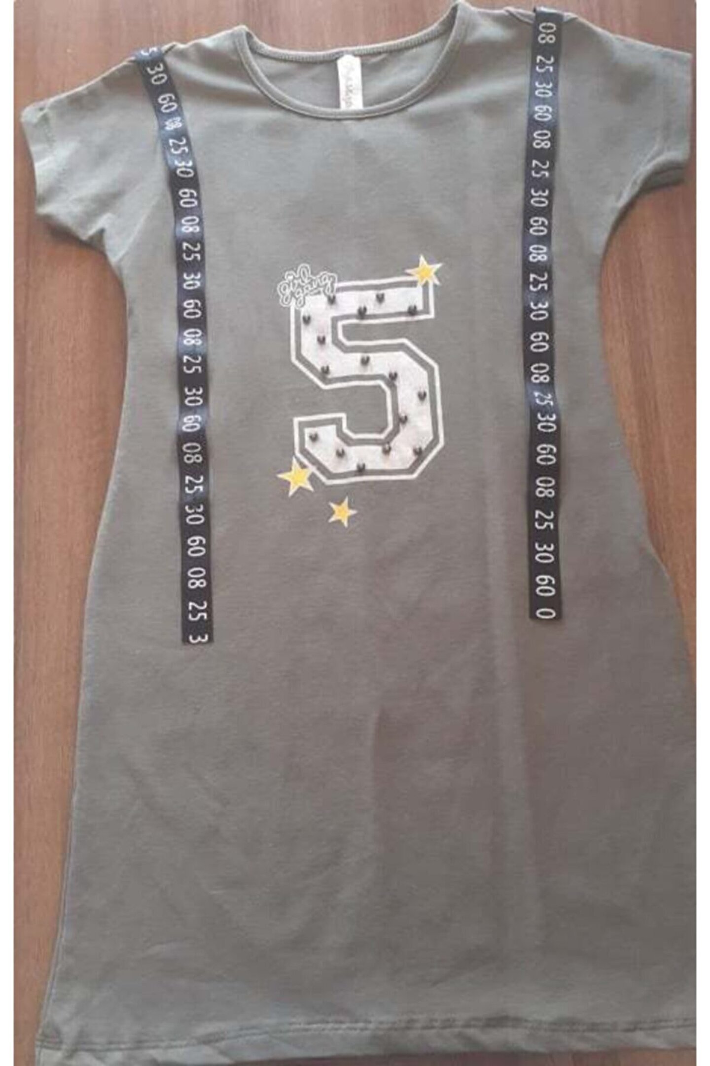 Mavera Haki Yeşil Önü Baskılı Boncuklu Yanlardan Kemerli Elbise Tarzı Çocuk Tunik