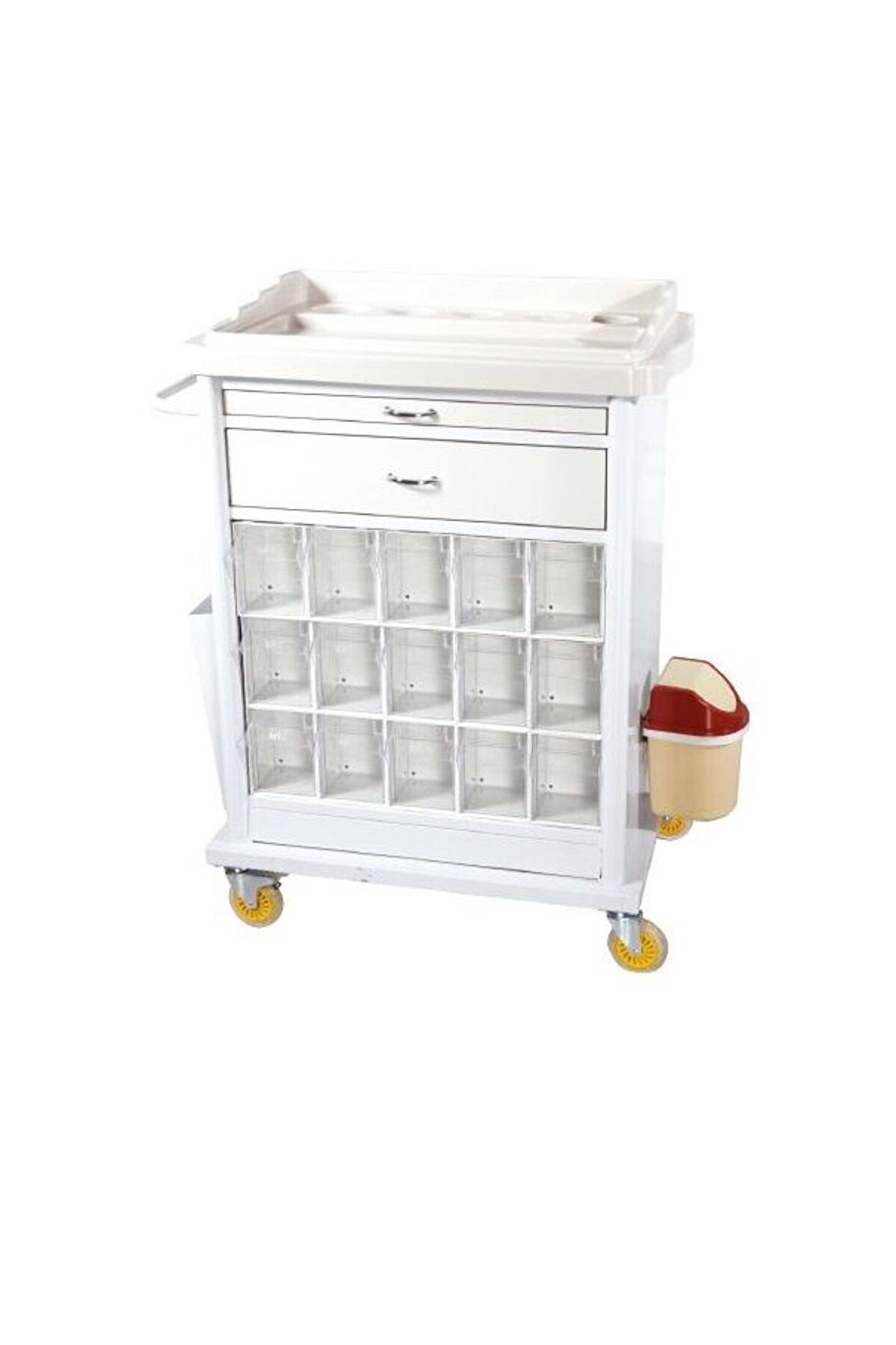 • Metal gövde. • ABS Üst tabla. • Metal itme kolu. • Şeffaf ilaç gözü.(30 adet) • Çöp kovası. • Dosya ve sonda gözü. • Ahşap çekmeceli. (1 adet) • İlaç hazırlık rafı. (1 adet) • Tekerlekler ikisi kilitli. • Elektrostatik toz boyalı gövde.(RAL 7035) Dış Boyutlar: 545 x 890 mm Yükseklik: 1065 mm Tekerler: 100 mm">