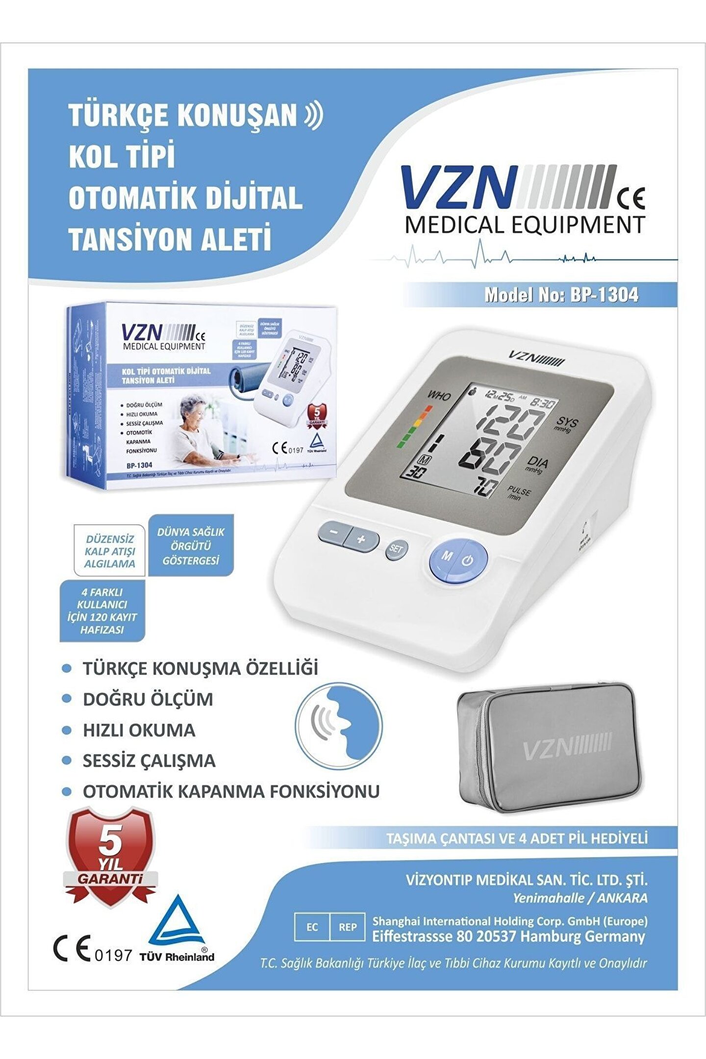 Klinik Olarak Doğru: Klinik olarak test edilmiş VZN Marka dijital tansiyon aletiniz, yüksek tansiyon ve düzensiz kalp atışı tespiti için hızlı ve doğru sonuçlar sağlamak üzere gelişmiş yüksek hassasiyetli çiplerle donatılmıştır; dijital tansiyon aletini ayrıca, referansınız için son üç okumanın ortalamasını otomatik olarak görüntüler ; 120 Kayıt Hafıza & 4 Kullanıcı Modu: Dijital tansiyon aletiniz farklı 4 kişi arasında paylaştırılabilir sonuç hafızasına sahiptir, dijital tansiyon aletiniz, her kullanıcı için bir tarih ve saat ile beraber 30 adede kadar okumayı saklar; . ; Büyük Lcd Ekran: Kullanıcı dostu dijital tansiyon aletiniz geniş 3,2 inç HD ekranı, net yazı tipleri, büyük sayılar, yanlış işlem hatırlatıcı simgeleri vardır, bu da sonuçları kontrol etmeyi daha kolay ve hızlı hale getirir, özellikle yaşlılar için uygundur ; Kullanımı Kolay: Tek tuşla çalışan dijital tansiyon aletiniz tamamen otomatiktir; Sadece manşeti takın, başlat/durdur düğmesine basın ve sonuçları 1 dakika içinde sonuç alacaksınız; ;