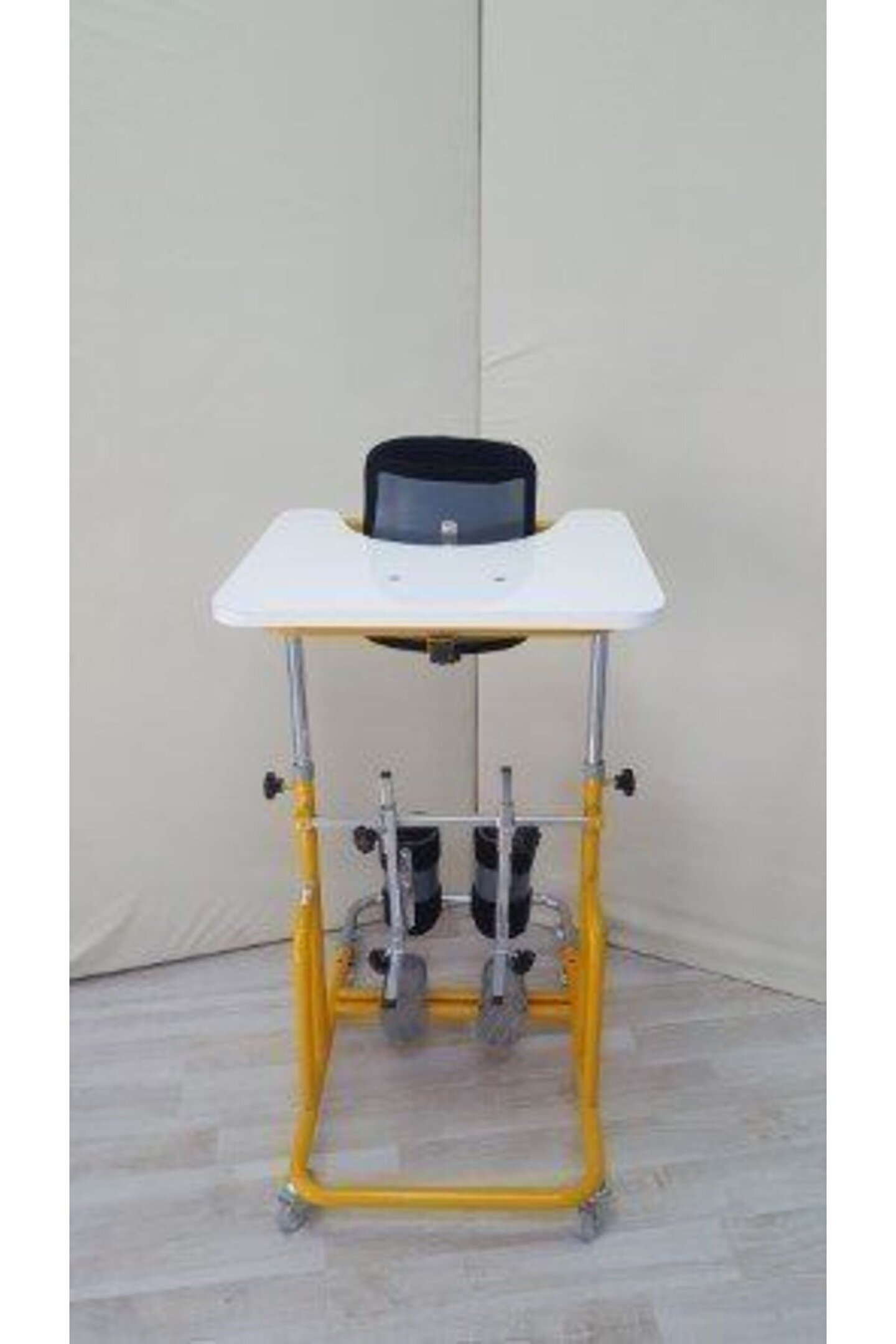 Ayakta durma sandalyesi dik konumlandırma cihazı Ayakta dik durma sehpası vucud dengesine yardımcı ile dik pozisyonunda durabilmesi için 02, yaş çocuk ve yetişkin modelleri ile vucüd dengesine yardımcı olan cihazdır. Cp ayakta durma sehpası kullanımı kullanıcı hastanın cihazın içine girip ayaklarının üstüne basıp. Ayak emniyeti alınır. Diz destek ayarı yapılır. Bel destek bantı bağlanarak kalça dik bağlantı ayarı yapılır. Koltuk altı destek aparatı ile göğüs destek ayarı yapılır. Çalışma masası ayarı kol mesafesi ayarı yapılarak calışma masası ayarı yapılır. Kullanıcının ayaklarını sabitlemek için ayak bağlama mekanizması bacaklarını dik tutmak için diz kapağı destek mekanizması kalça bel dik ayarını sağlamak için kemer sıkma bandajı göğüs omuz dik durma pozisypnu için koltuk altı destek mekanizması ayar mekanizmalarından ayarlanır. Cp ayakta dik durma sehpası çeşitleri kullanıcı hastalar için 3 çeşittir O2 yaş 11 yaş arası kullanıcıları için 11 yaş 16 yaş arası kullanıcılar için 16 yaş 45 yaş arası kullanıcılar için Cp ayakta dik durma sehpası garantisi 2 yıldır kaliteli iskelet yapısı çelik ve ahşap malzemeden üretilmiştir, deforma olmaz Cp ayakta dik durma sehpasının bakım gerektiren her hangi bir mekanizması yoktur. Firmamız tarafından yerli üretim olan cihazın yedek parça sorunu yoktur. Vucud direnci eklem mekanizmalarının gelişimi için fizik tedavi doktorlarının hastasına belli bir program dahilinde tavsiye edilerek alınıp kullanılan cihazdır. Hasta ve hasta sahipleri bu cihazı doktor tavsiyesi ile alınıp kullanılan üründür. Yetişkin ve Çocuk Boyları Vardır.
