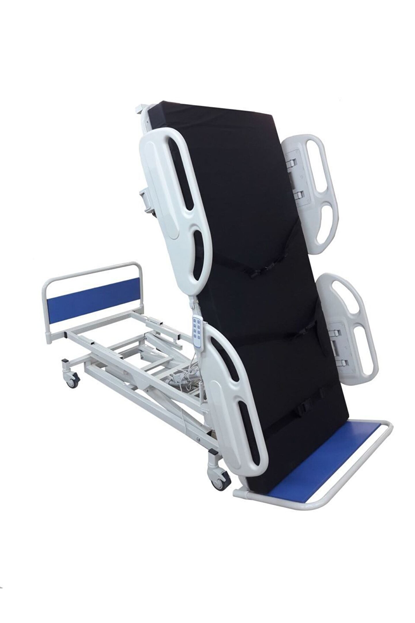 Dik Pozisyon Veren Karyola E-161/A - Dik Pozisyon Veren Karyola Boyut 100 x 200 x 55-95 cm Ağırlık 100 Kg Elektrik motorlar ile baş,ayak,dik pozisyon ve yükseklik hareketi ABS antistatik ikisi frenli dört adet teker ABS korkuluk ve ahşap başlık sistemi Serum askısı El kumandası 80 derece kalkabilen üst platform (hastanın dik pozisyona getirebilme) Hasta güvenliğini sağlayan 3 adet emniyet kemeri