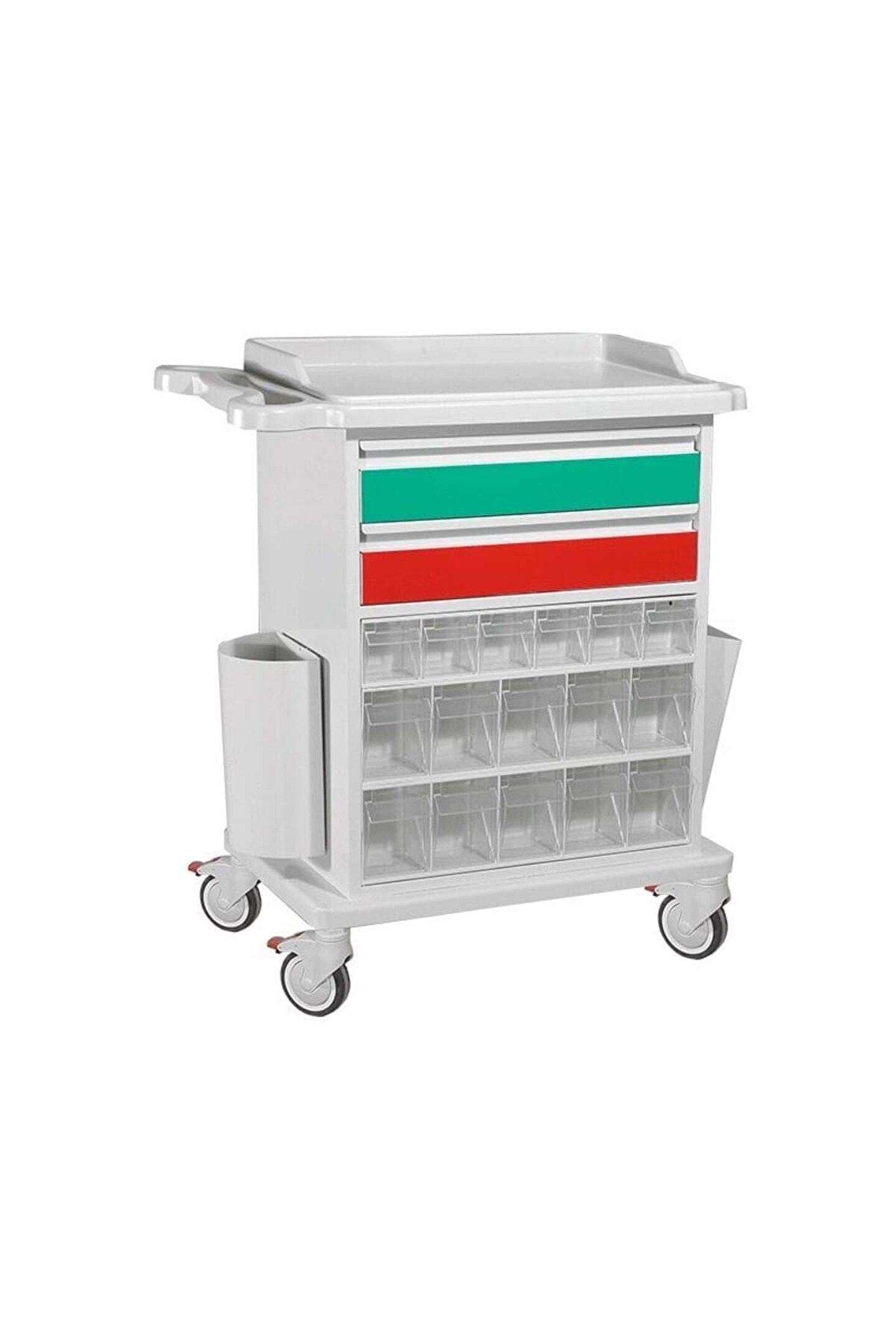Beş Çekmeceli Pansuman Arabası Boyut 50 x 90 x 110 cm Ağırlık 47 Kg Metal sac gövde üzeri Antibakteriyel elektrostatik toz boya ABS antistatik ikisi frenli dört adet teker ABS antibakteriyel üst tezgah Dosyalık ve çöp kutusu 32 adet antibakteriyel şeffaf ilaç kutuları İki adet çekmece İtme kolu