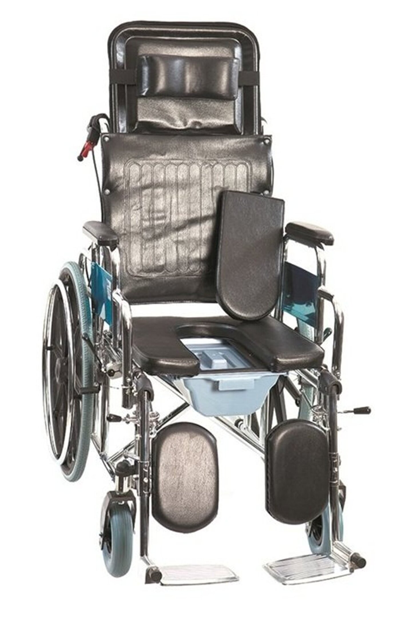 G4 tekerlekli sandalyeUzun süreli kullanımlarda kullanıcı rahatlığı göz önünde bulundurularak tasarlanmış sırtlık kısmı 6 kademede 160° yatırılarak şezlong pozisyonu alabilmektedir.Kullanıcının baş yapısına uygun ergonomiklikte pozisyonlandırılabilir başlığa sahiptir.Çıkarılabilir kolçaklar kullanıcının yatak, araba vb. alanlara transferini kolaylaştırır.Çıkarılabilir ayaklıkları sayesinde asansör vb. dar alanlarda ekstra manevra kabiliyeti sağlar.Ayaklıklar kullanıcı konforu düşünülerek, bacaklarını ileri doğru uzatabilmesine olanak sağlamak için 90° kaldırılabilir olarak tasarlanmıştır.Ayaklık ve baldırlık kısımları kullanıcı boyuna göre ayarlanabilir özelliktedir.200*50 PU ön tekerlekler yüzeyi bozuk alanlarda ve mazgallarda rahat sürüş sağlar.Katlanabilir gövde yapısı taşıma ve depolama kolaylığı sağlar.Basamak atlatma çubuğu ve el tutaçları sayesinde refakatçi kullanımına uygundur.Eğimli alanlarda ve şezlong pozisyonunda kullanımı sırasında kullanıcının geriye düşmesini engelleyen anti-tipper tekere sahiptir.Kullanıcının tuvalet ihtiyacını karşılayabilmesi için lazımlık şeklinde oturma yeri ve koku önleyici kapaklı lazımlık kovasına sahiptir. vinil döşeme, uzun süreli kullanımlarda bakteri oluşumunu engelle golfi 4 tekerlekli sandalye