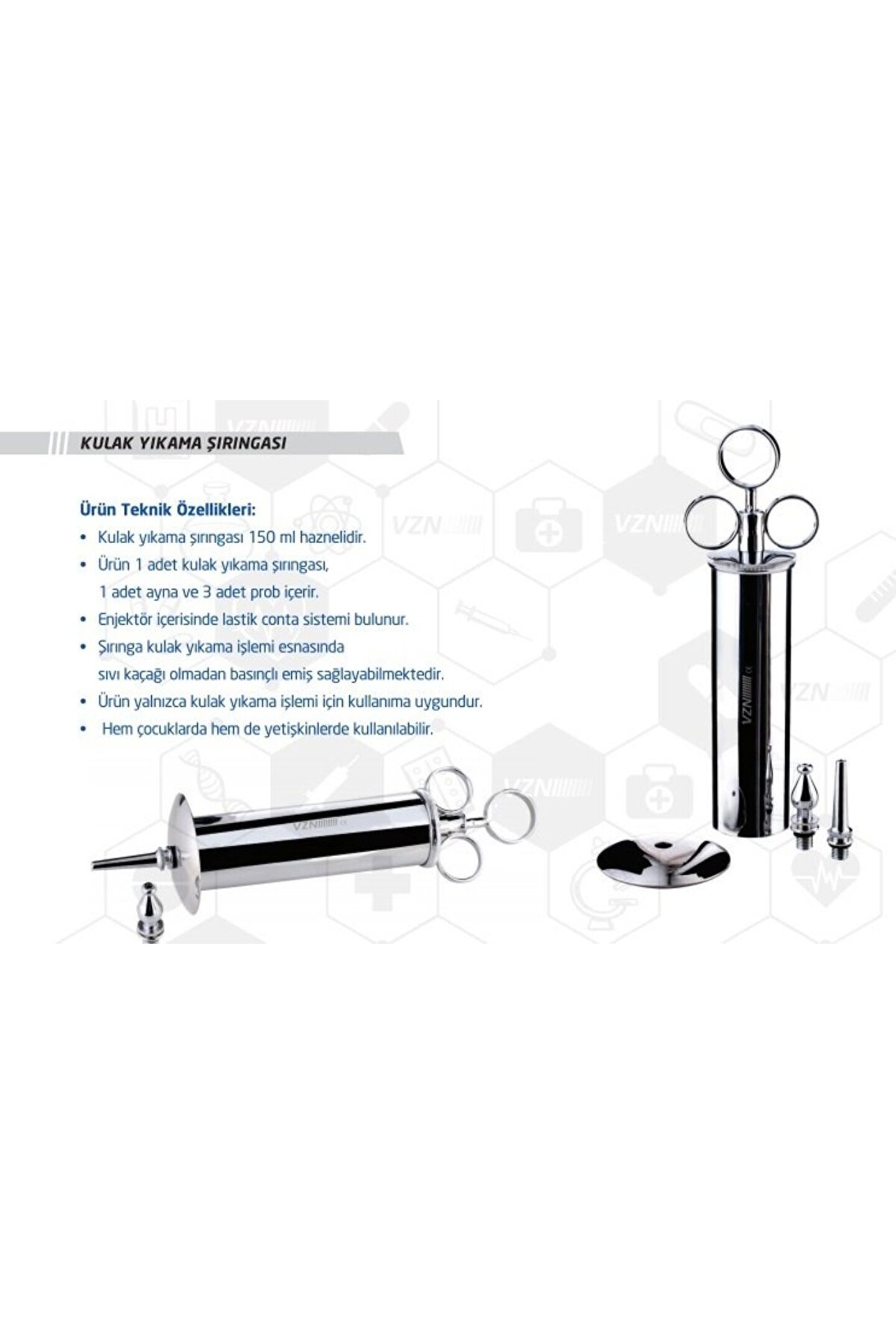Kulak yıkama şırıngası 150 ml haznelidir. Ürün 1 adet kulak yıkama şırıngası, 1 adet ayna ve 3 adet prob içerir. Enjektör içerisinde lastik conta sistemi bulunur. Şırınga kulak yıkama işlemi esnasında sıvı kaçağı olmadan basınçlı emiş sağlayabilmektedir. Ürün yalnızca kulak yıkama işlemi için kullanıma uygundur. Hem çocuklarda hem de yetişkinlerde kullanılabilir.