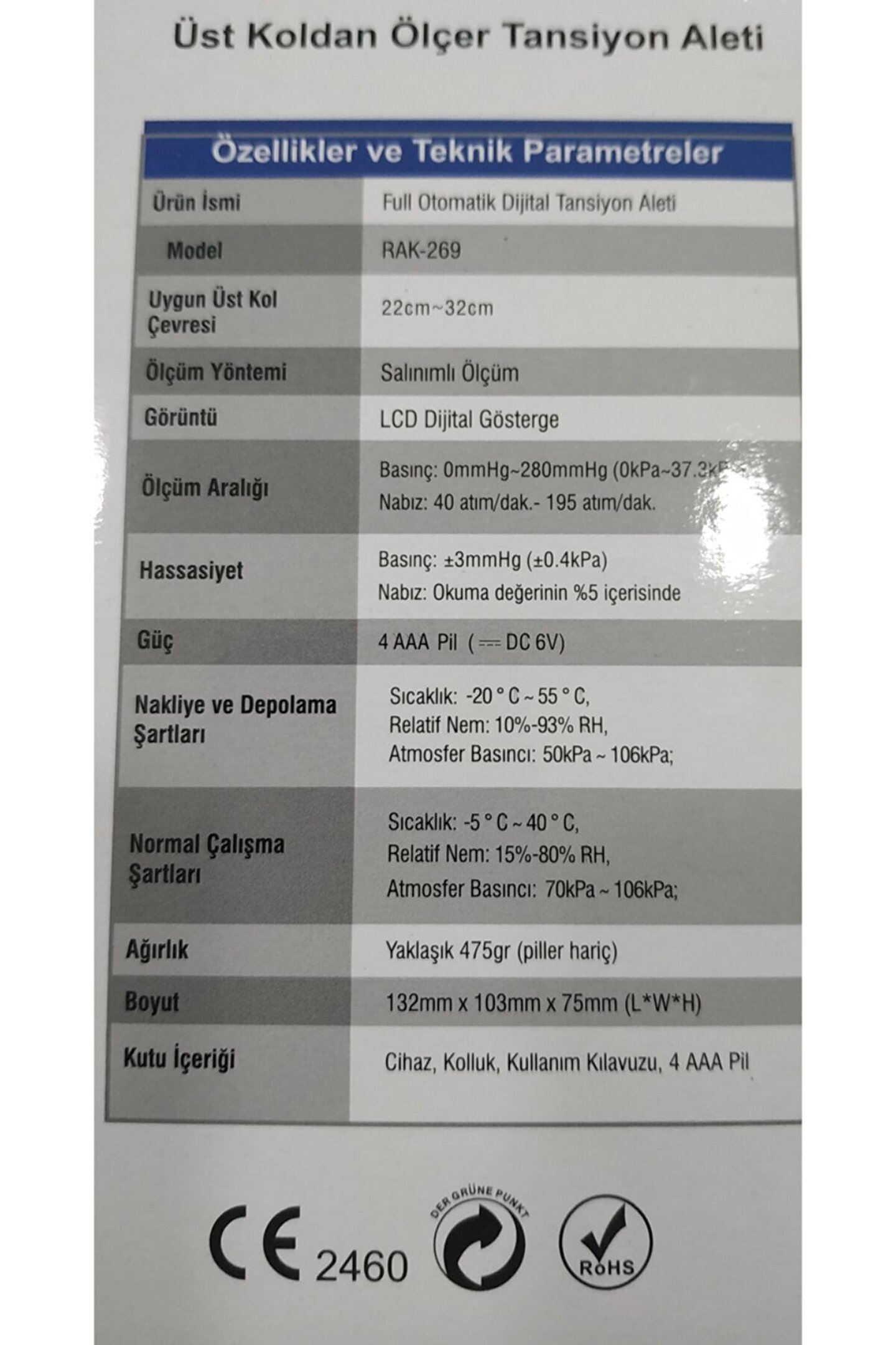 İstanbul Medikal Market Güvencesiyle, LCD dijital ekranı geniş olduğundan ölçüm neticesinin rahatlıkla görünmesini , düzensiz nabız atışını yakalama özelliğine de sahiptir. 4 adet AAA pil ile çalışır. Pil ömrü yaklaşık 300 ölçüm yapılabilmesini sağlamaktadır. ; 3 satır genişliğinden oluşan LCD ekran ; Düzensiz kalp ritmini kontrol eder ve ekranda gösterir. ; Normal ve geniş kollar için uyumlu manşet. ; Pil ömrünü uzatmak için tasarruflu sistem. ; Test edilmiş ve klinik tarafından onaylanmış. ; . ;