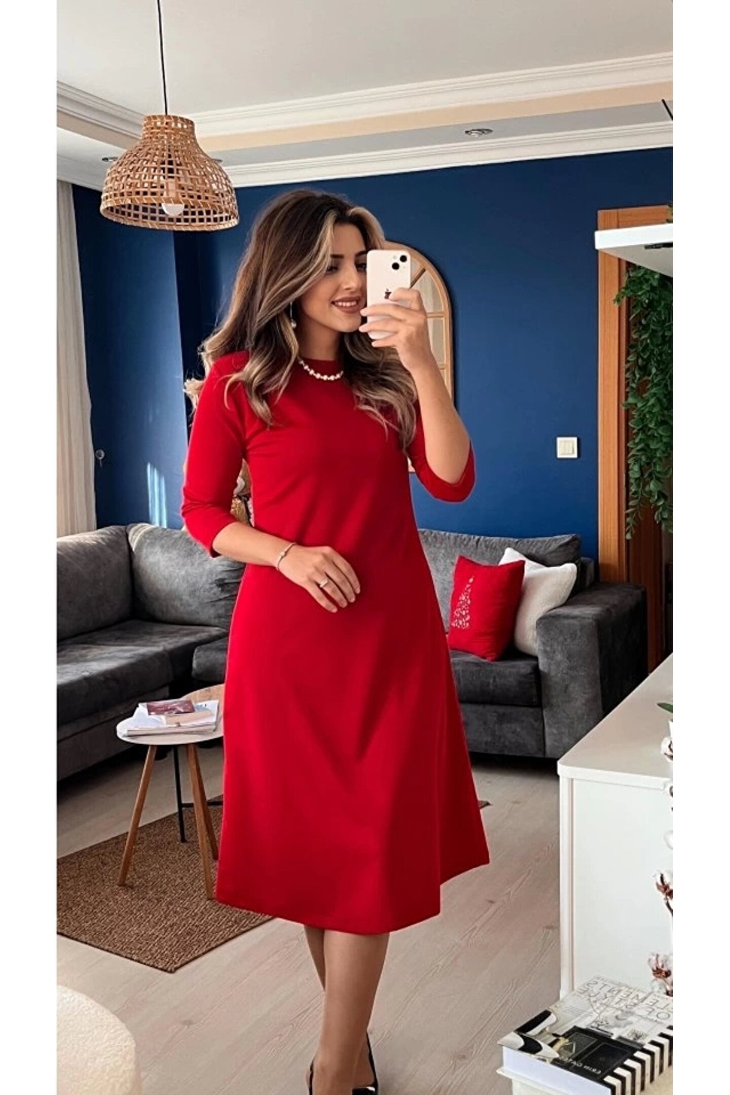 Kadın Uzun Kollu Bisiklet Yaka Midi Ithal Krep Elbise