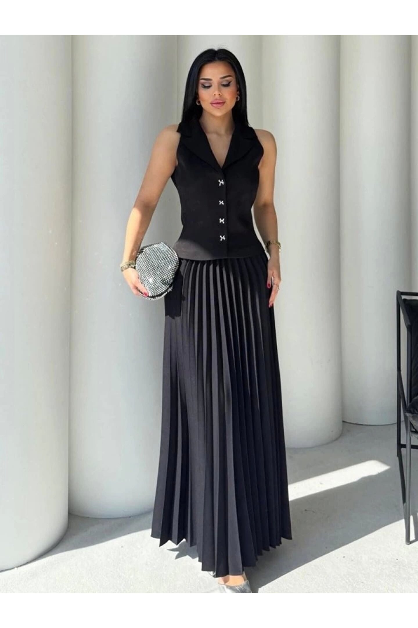 Modelin Ölçüleri: Boy:165, Kg:55, Göğüs:90, Bel:72, Kalça: 100 Modelin üzerindeki ürün M/38 bedendir Trendleri belirleyen kadın giyim markası velmorafashion'a hoşgeldiniz! VelmoraFashion, kadınların tarzlarını ifade etmelerine ve güçlü bir duruş sergilemelerine olanak tanıyan bir markadır.; 2018 yılından bu yana sektörde varlığını sürdüren firmamız, yenilikçi tasarımları ve kaliteli ürünleriyle dikkat çekiyor.; VelmoraFashion olarak amacımız, her kadının kendine özgü tarzını yansıtabileceği, güvenilir ve şık giyim seçenekleri sunmaktır.; Koleksiyonlarımızda her zevke hitap eden parçaları bulabilirsiniz.; Günlük hayatta rahatlıkla tercih edilebilecek şık elbiselerden iş görüşmelerinde stilinizi tamamlayacak takım elbiselere, spor giyimden abiye modellere kadar geniş bir ürün yelpazemiz bulunmaktadır.; Tasarımlarımızı oluştururken moda trendlerini yakından takip ediyor, farklı tarzlara ve bedenlere uygun seçenekler sunmaya özen gösteriyoruz.; Aynı zamanda kalite ve dayanıklılık da önceliklerimiz arasındadır.; Her parça, titizlikle seçilen kumaşlar ve dikkatle işlenen detaylarla özenle üretilmektedir.; Müşteri memnuniyeti bizim için en önemli önceliktir.; Profesyonel müşteri hizmetleri ekibimiz, her adımda size yardımcı olmak ve alışveriş deneyiminizi en üst düzeye çıkarmak için buradadır.; Siz değerli müşterilerimizin geri bildirimleri, bizi daha da ileriye taşımak için önemli bir kaynaktır.; Velmora Fashion olarak, sadece giyimde değil, aynı zamanda kadınların güçlendirilmesi ve kendilerini ifade etmeleri konusunda da bir misyon taşıyoruz.; Her kadının kendi tarzını keşfetmesine ve kendine güvenle adım atmasına yardımcı olmak için buradayız.; VELMORAFAShion'da her detayı düşünülmüş, şıklığı ve rahatlığı bir arada sunan parçalarla dolu koleksiyonlarımızı keşfetmek için sizi mağazamıza bekliyoruz.; Siz de ailemize katılın ve tarzınızı keşfedin!