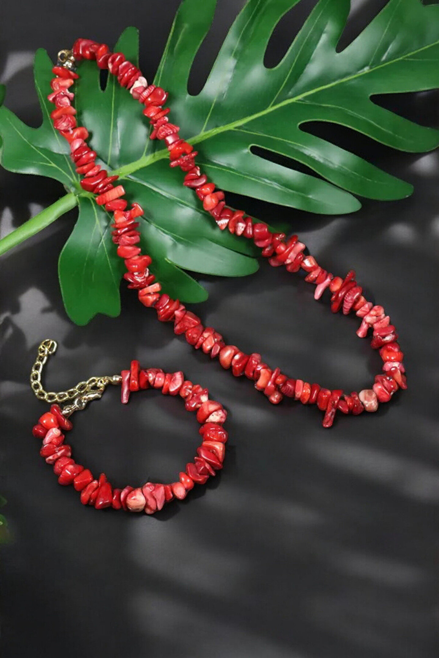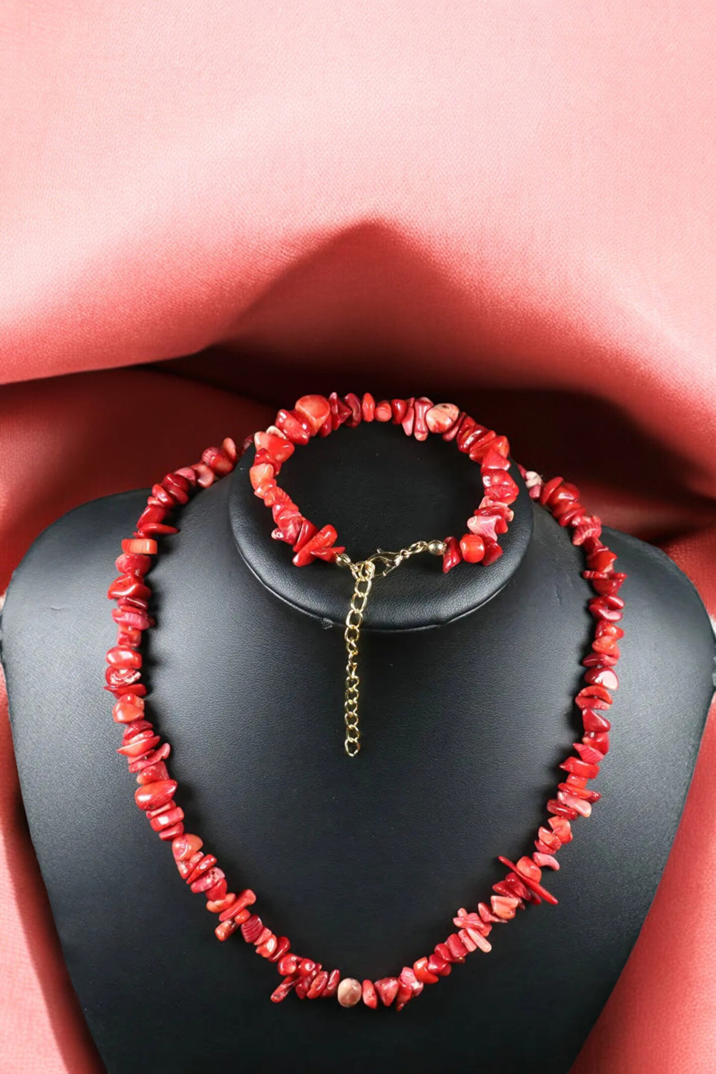 Doğal taş kullanımı ile öne çıkan bu kolye ve bileklik seti, şıklığınızı tamamlayacak zarif bir aksesuar seçeneği sunar; Mercan taşı kolye ve bileklik, kırık taş detaylarıyla benzersiz bir görünüm kazandırarak günlük kullanım için idealdir; Çelik tel ve halka çelik zincir kullanımı sayesinde dayanıklılık ve uzun ömürlü kullanım vaat eder; Doğal taş cinsi sayesinde her parça, doğanın güzelliklerini yansıtan eşsiz bir dokunuş sunar;