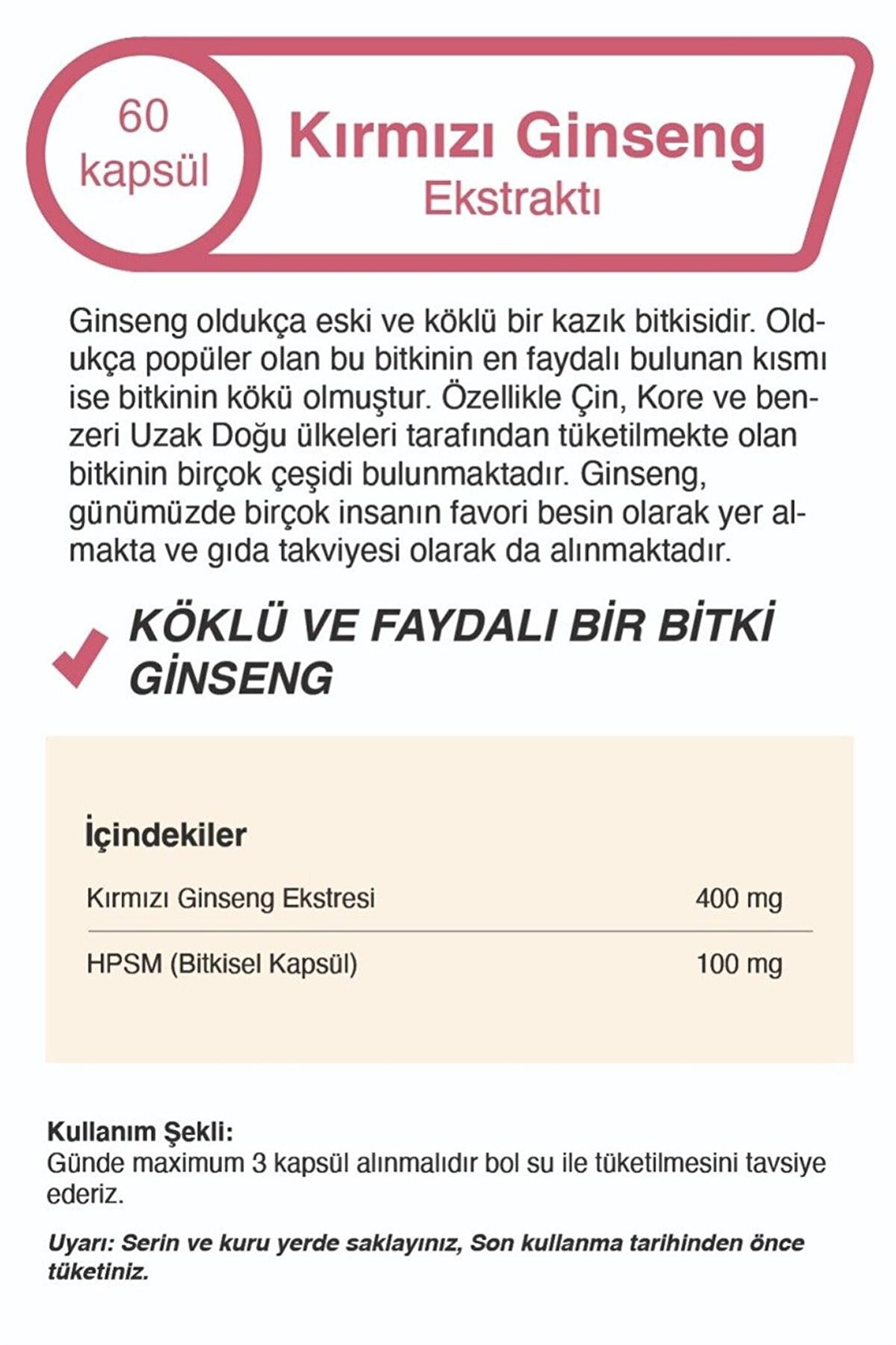 Ginseng oldukça eski ve köklü bir kazık bitkisidir. ; Oldukça popüler olan bu bitkinin en faydalı bulunan kısmı ise bitkinin kökü olmuştur. ; Özellikle Çin, Kore ve benzeri Uzak Doğu ülkeleri tarafından tüketilmekte olan bitkinin birçok çeşidi bulunmaktadır. ; Ginseng, günümüzde birçok insanın favori besin olarak yer almakta ve gıda takviyesi olarak da alınmaktadır. ; Kore Ginsengi Kırmızı Kore Ginsengi olarak bilinen bu ginseng türü vücudun enerji seviyesini arttırdığı ve yorgunluk ile mücadele ettiği bilinmektedir. ; Asya ginsengi olarak bilinen bu türün diğer bir adı ise Panax ginsengdir. ; Ginseng birçok enerji içeceği, bazı gıda takviyesi içeriği olarak ve daha birçok ürünün içeriğinde yer almaktadır.;