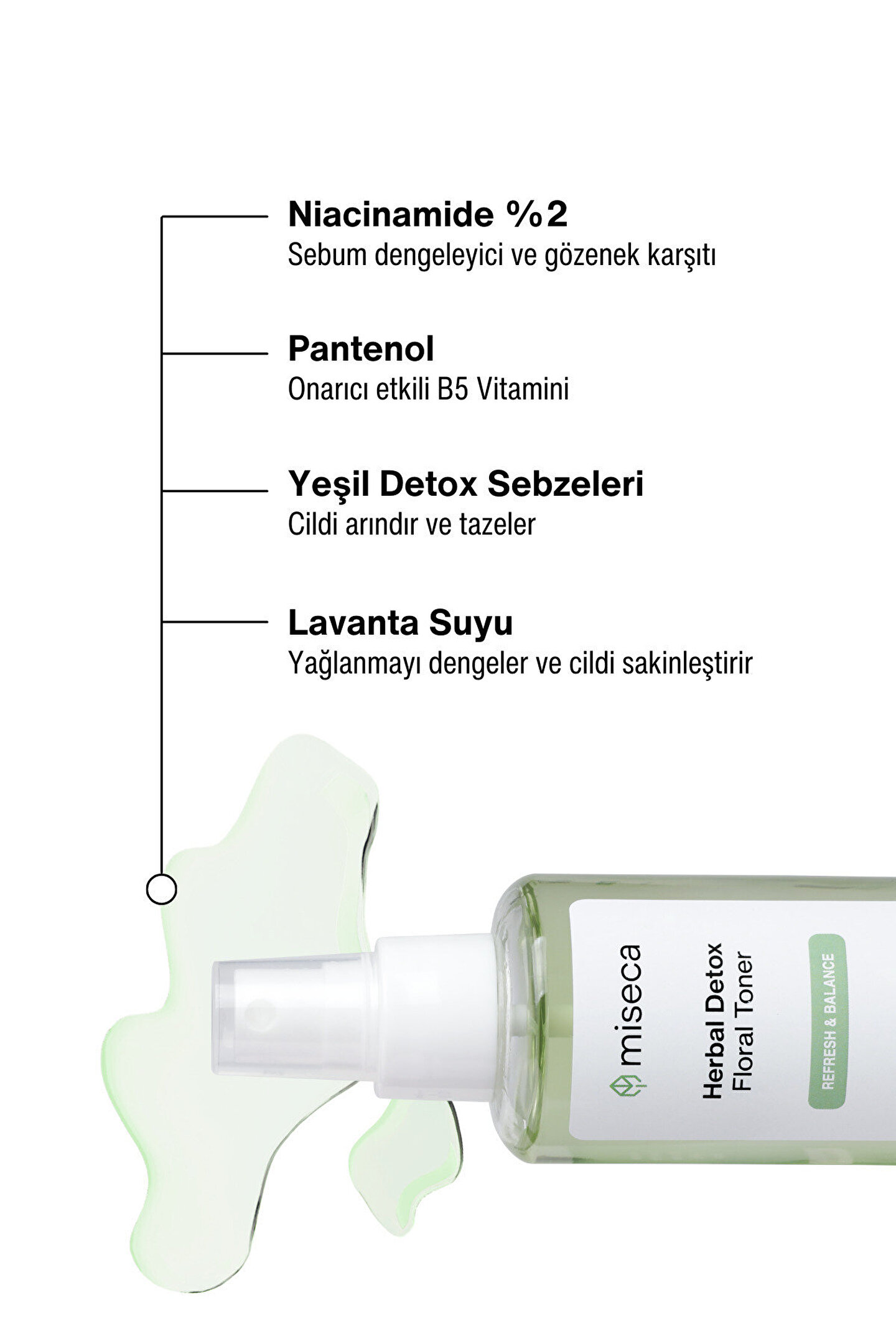 Temizleme aşamasından sonra cildi nemlendirir.; Cildin sebum dengesinin sağlanmasına katkı sağlar, yağlanmayı azaltır.; Gözeneklerin sıkılaşmasına destek olur.; %50'nin üzerinde doğal bitki suyu içerir.; Tüm ciltlere ve günlük kullanıma uygundur.; Ambalaj: 100 ml sprey cam şişe İçindekiler: Aqua (Saf Su), Lavandula Angustifolia Flower Water (Lavanta Suyu), Myrtus Communis Leaf Water (Mersin Yaprağı Suyu), Laurus Nobilis Leaf/Stem Water (Defne Suyu), Pentylene Glycol (Bitkisel Nemlendirici/Koruyucu), Glycerin (Bitkisel Nemlendirici), Niacinamide (B3 Vitamini), Camellia Sinensis Leaf Extract (Yeşil Çay Özü), Salix Alba Bark Extract (Söğüt Kabuğu Özü), Sodium Hyaluronate (Hyalüronik Asit) pH: 5,5-6,0 Kullanım: Gözleriniz ve ağzınız kapalı şekilde temiz yüzünüze pompa yardımıyla birkaç kez püskürtünüz.; İhtiyaca göre gün içerisinde 2-3 defa kullanılabilir.; Cilt sebum dengesinin sağlanmasına ve gözenek görünümünün azaltılmasına katkı sağlar.; Uyarılar: 25 derecenin altındaki oda sıcaklığında veya buzdolabında saklayınız.; Göz ile temasından kaçınınız, temas halinde bol su ile yıkayınız.; Kullanmadan önce alerji testi yapınız.; Haricen kullanılır.
